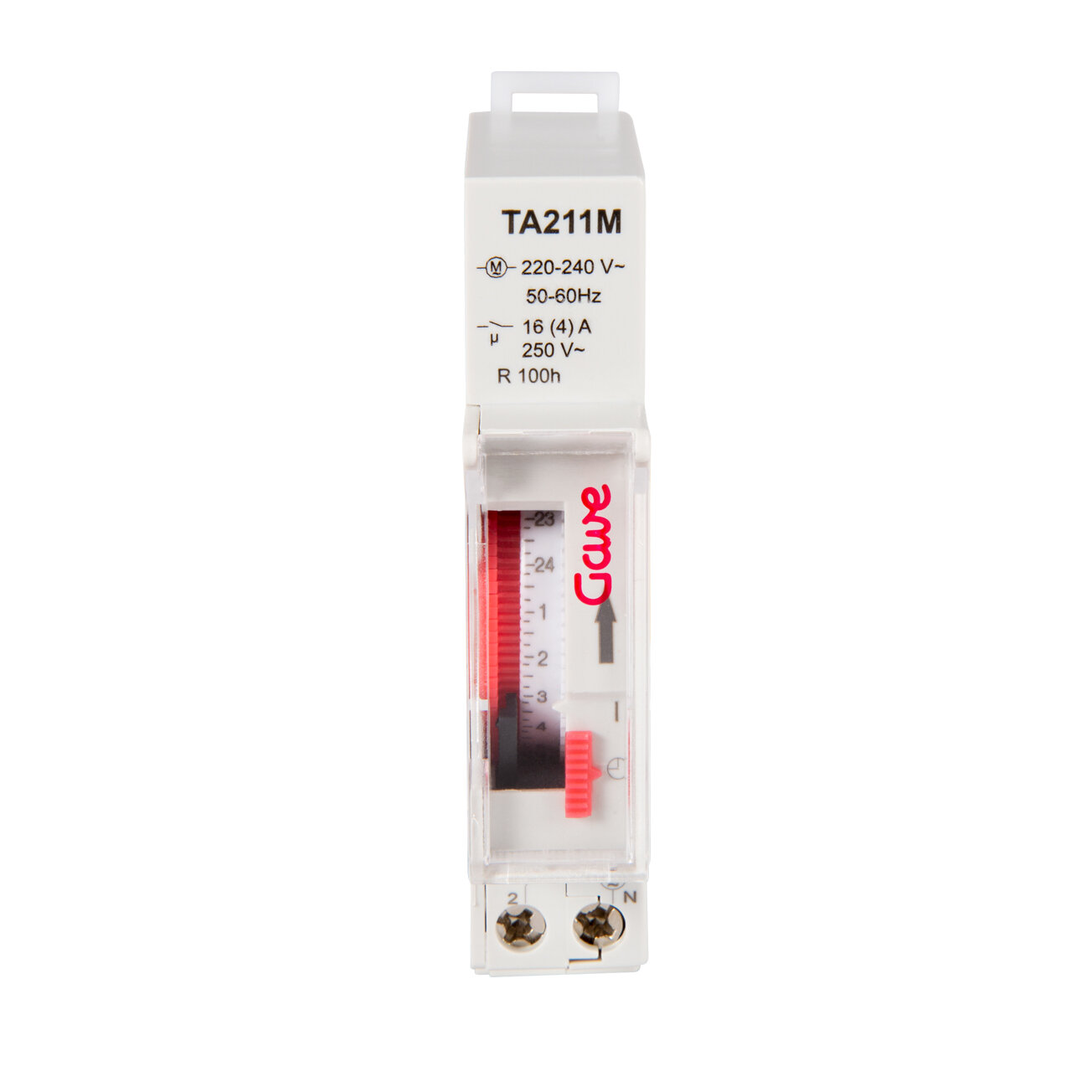 Interruptor horario analógico de ciclo diario con programación ON/OFF, 1 módulo de ancho con alimentación a 220-240 V AC 50/60 Hz, salida de 1 contacto NA, potencia de conexión de 15A con carga resistiva y 4A con carga inductiva (cosø 0,6), maniobra mínima 15 minutos, programación por pestaña, conmutador manual fijo ON y modo automático, reserva de marcha 100h, tapa abatible, montaje carril DIN, conexión con terminal de jaula hasta 4mm2, consumo de energía 1 VA, protección IP20.