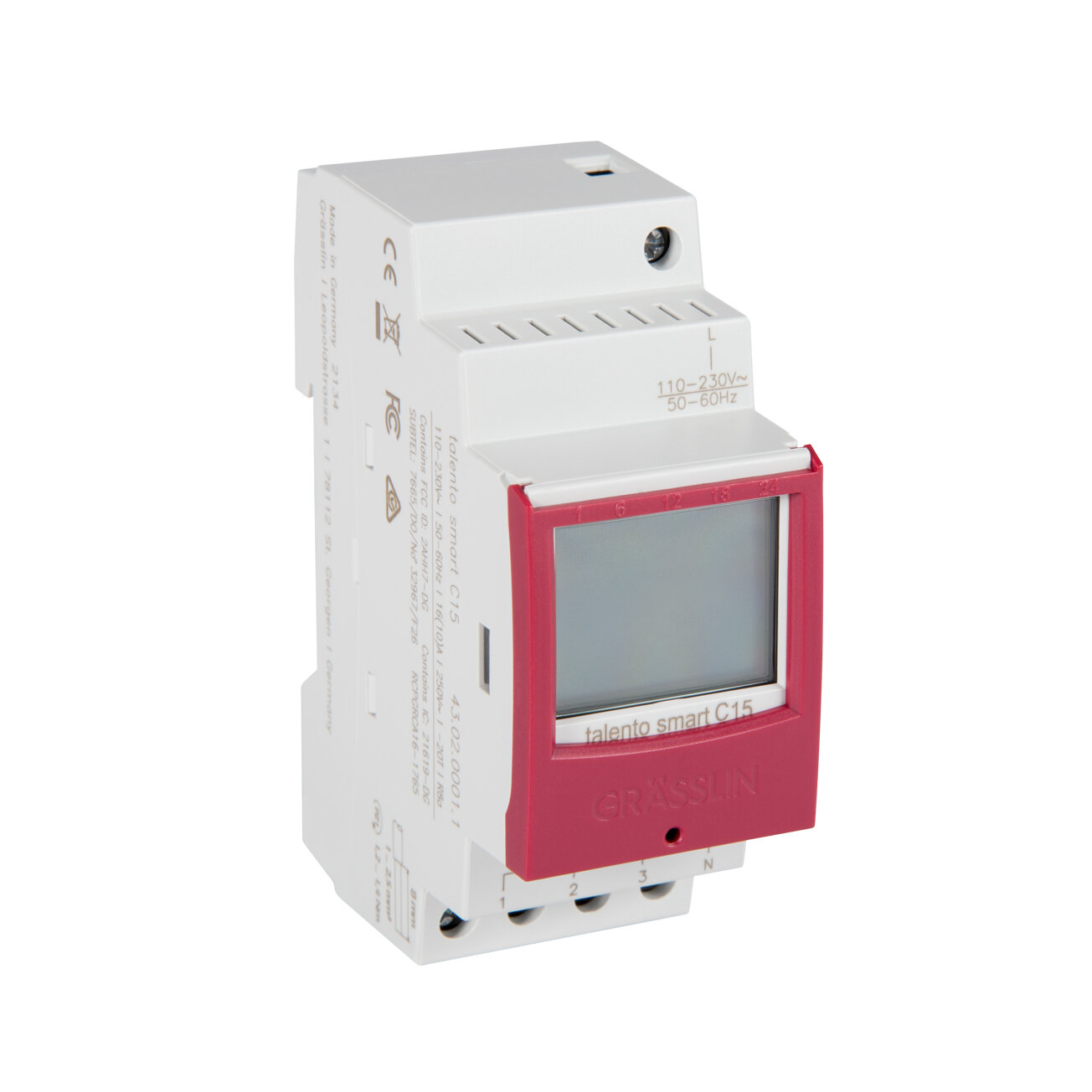 Interruptor horario digital Talento Smart versión Classic de 2 módulos y 1 salida conmutada con alimentación AC 110-230V ±10% 50-60Hz, potencia de conexión de 16A con carga resistiva y 10A con carga inductiva (cosø 0,6), programación semanal y con fechas, función ON/OFF, ciclo, pulso, aleatorio y astronómica, maniobra mínima 1 segundo en funciones ciclo y pulso y 1 minutos para las funciones restantes, 500 posiciones de memoria, capacidad 50 programas asociados o no a fechas, posibilidad de introducción automática de festivos nacionales en programaciones con fechas, Bluetooth integrado para programación mediante APP gratuita desde teléfono móvil o PC, cambio de hora verano / invierno automático, cuentahoras en función del servicio, conmutador fijo ON/OFF y modo automático, reserva de 8 años con programación guardada en EEPROM, protección mediante código PIN y tapa precintable, montaje carril DIN, conexión con terminal de jaula hasta 2,5mm2, consumo de energía 1 VA, protección IP20.