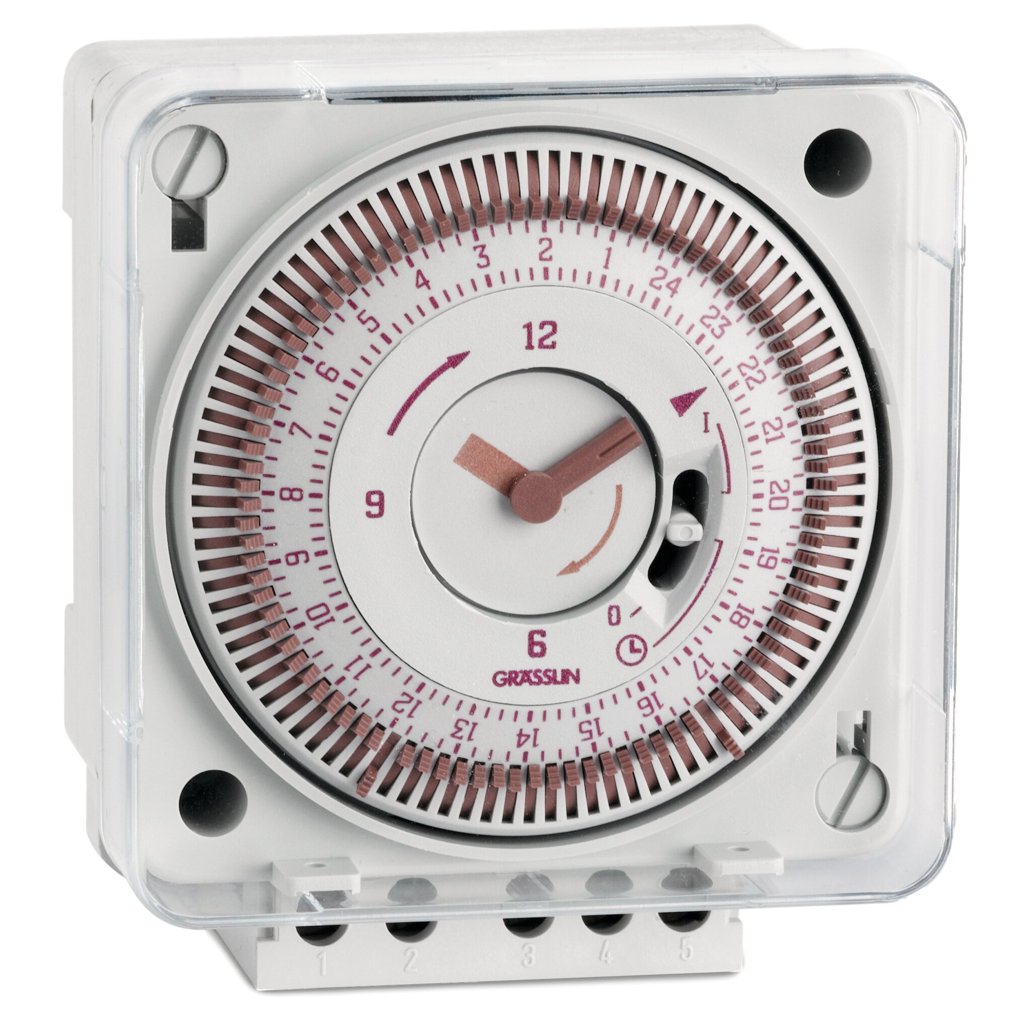 Interruptor horario universal analógico de ciclo diario con programación ON/OFF, alimentación a 230V AC 50Hz, 1 salida conmutada, potencia de conexión de 16A con carga resistiva y 8A con carga inductiva (cosø 0,6), maniobra mínima 15 minutos, programación por uñetas imperdibles, conmutador fijo ON/OFF y modo automático, reserva de marcha 150h, montaje carril DIN, consumo de energía 1 VA.