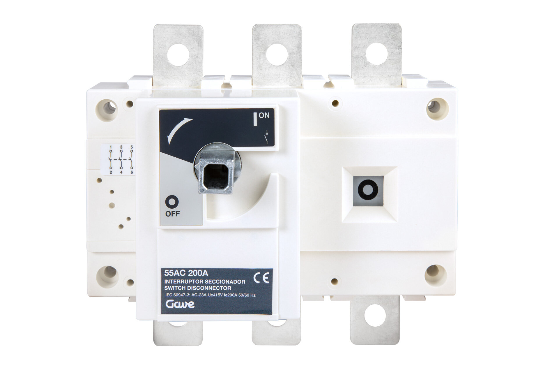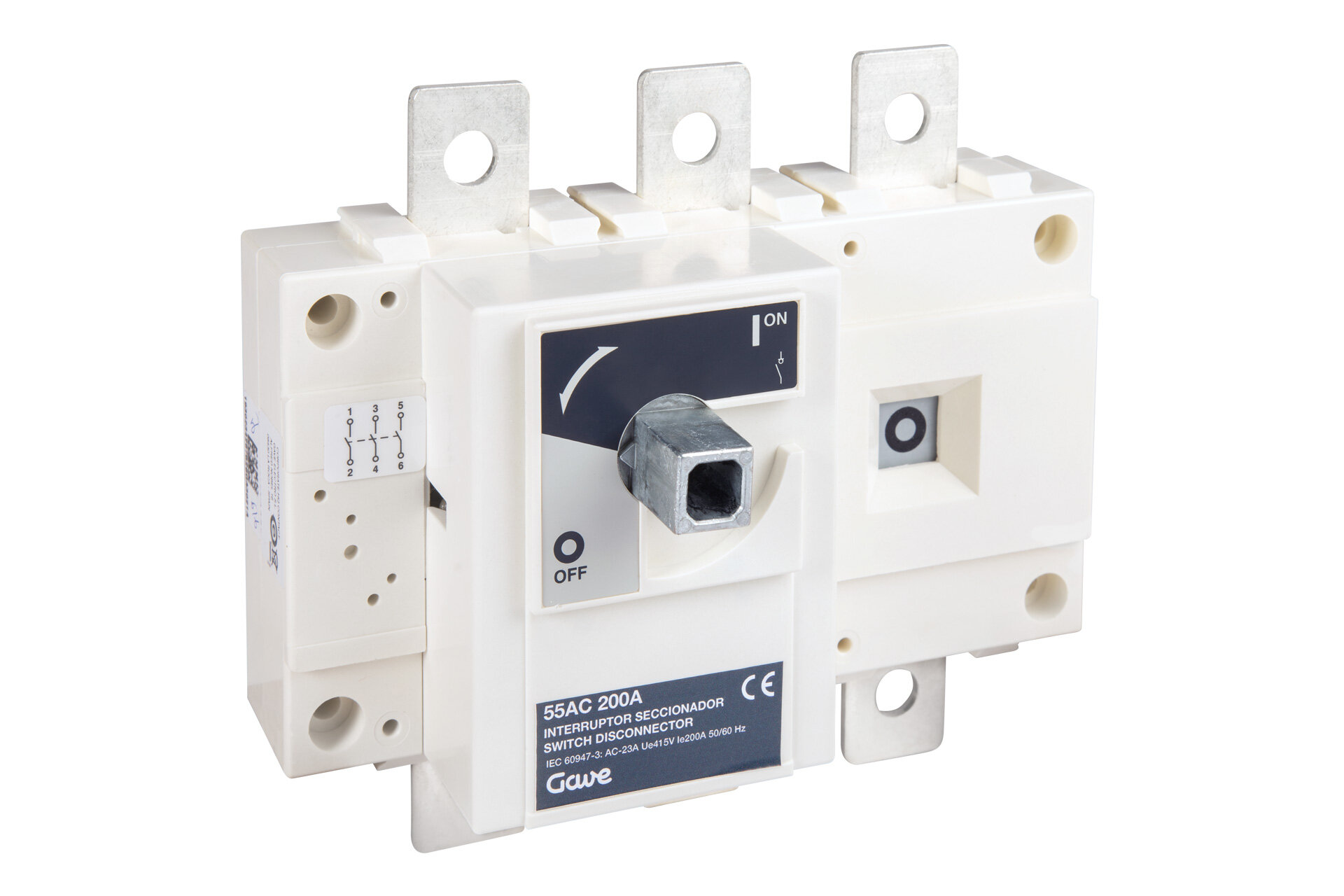 Interruptor-seccionador en carga de la serie 55AC de 3 polos 200A. Tamaño B4 de medidas 160x180x75. Opera en cargas AC-23A 415V y cargas DC-21 500V. Corte plenamente aparente. Las altas prestaciones de los materiales utilizados le confieren una alta resistencia térmica y dinámica. Suministrado sin mando se puede utilizar con múltiples tipos de mandos y múltiples accesorios como ejes prolongados, pantallas de separación o protección y contactos auxiliares.