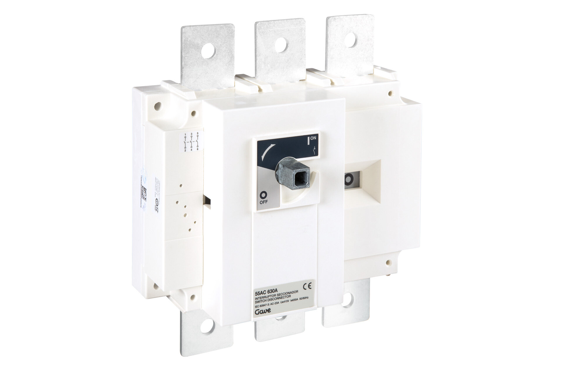 Interruptor-seccionador en carga de la serie 55AC de 3 polos 630A. Tamaño B5 de medidas 260x230x110. Opera en cargas AC-23A 415V y cargas DC-21 500V. Corte plenamente aparente. Las altas prestaciones de los materiales utilizados le confieren una alta resistencia térmica y dinámica. Suministrado sin mando se puede utilizar con múltiples tipos de mandos y múltiples accesorios como ejes prolongados, pantallas de separación o protección y contactos auxiliares.