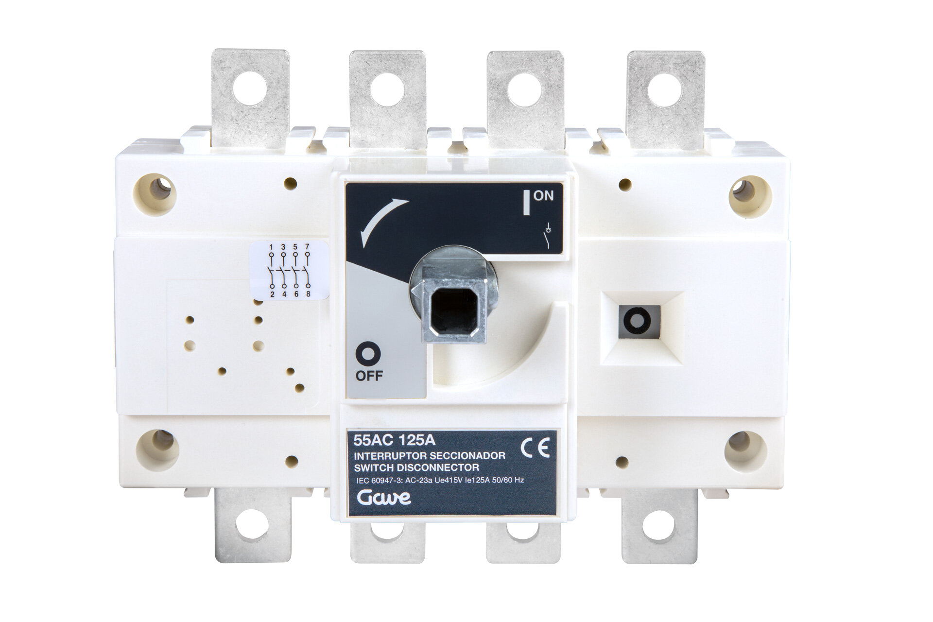 Interruptor-seccionador en carga de la serie 55AC de 4 polos 125A. Tamaño B3 de medidas 135x170x65. Opera en cargas AC-23A 415V y cargas DC-21 500V. Corte plenamente aparente. Las altas prestaciones de los materiales utilizados le confieren una alta resistencia térmica y dinámica. Suministrado sin mando se puede utilizar con múltiples tipos de mandos y múltiples accesorios como ejes prolongados, pantallas de separación o protección y contactos auxiliares.