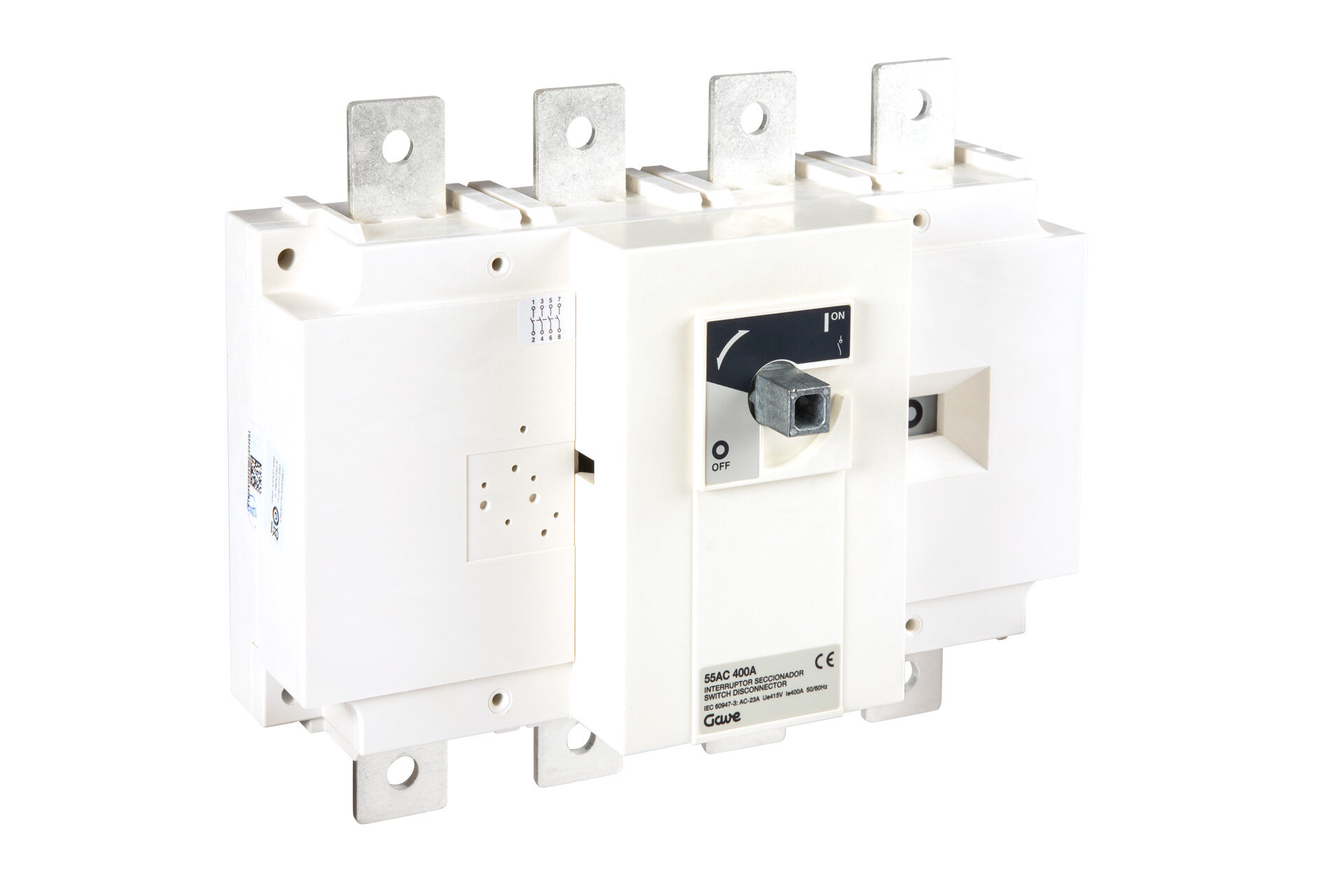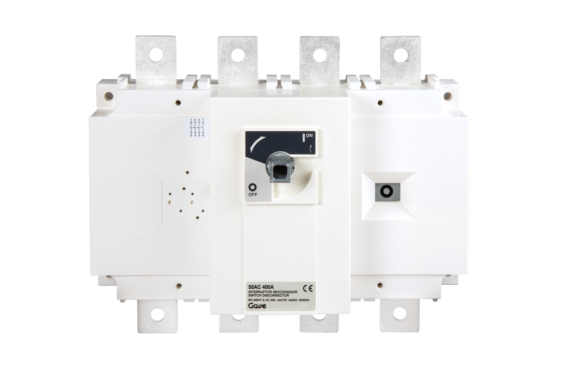 Interruptor-seccionador en carga de la serie 55AC de 4 polos 400A. Tamaño B5 de medidas 235x290x110. Opera en cargas AC-23A 415V y cargas DC-21 500V. Corte plenamente aparente. Las altas prestaciones de los materiales utilizados le confieren una alta resistencia térmica y dinámica. Suministrado sin mando se puede utilizar con múltiples tipos de mandos y múltiples accesorios como ejes prolongados, pantallas de separación o protección y contactos auxiliares.