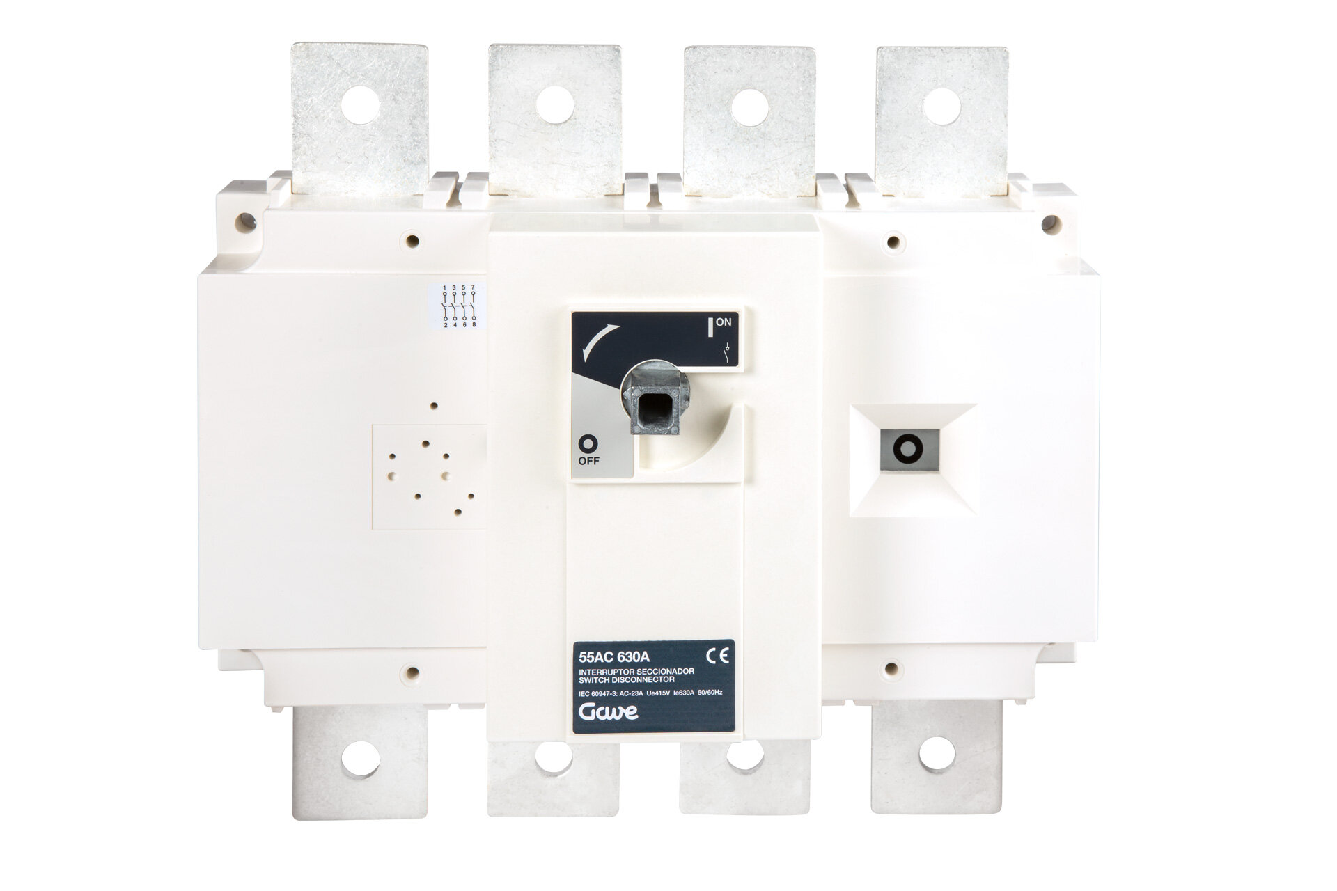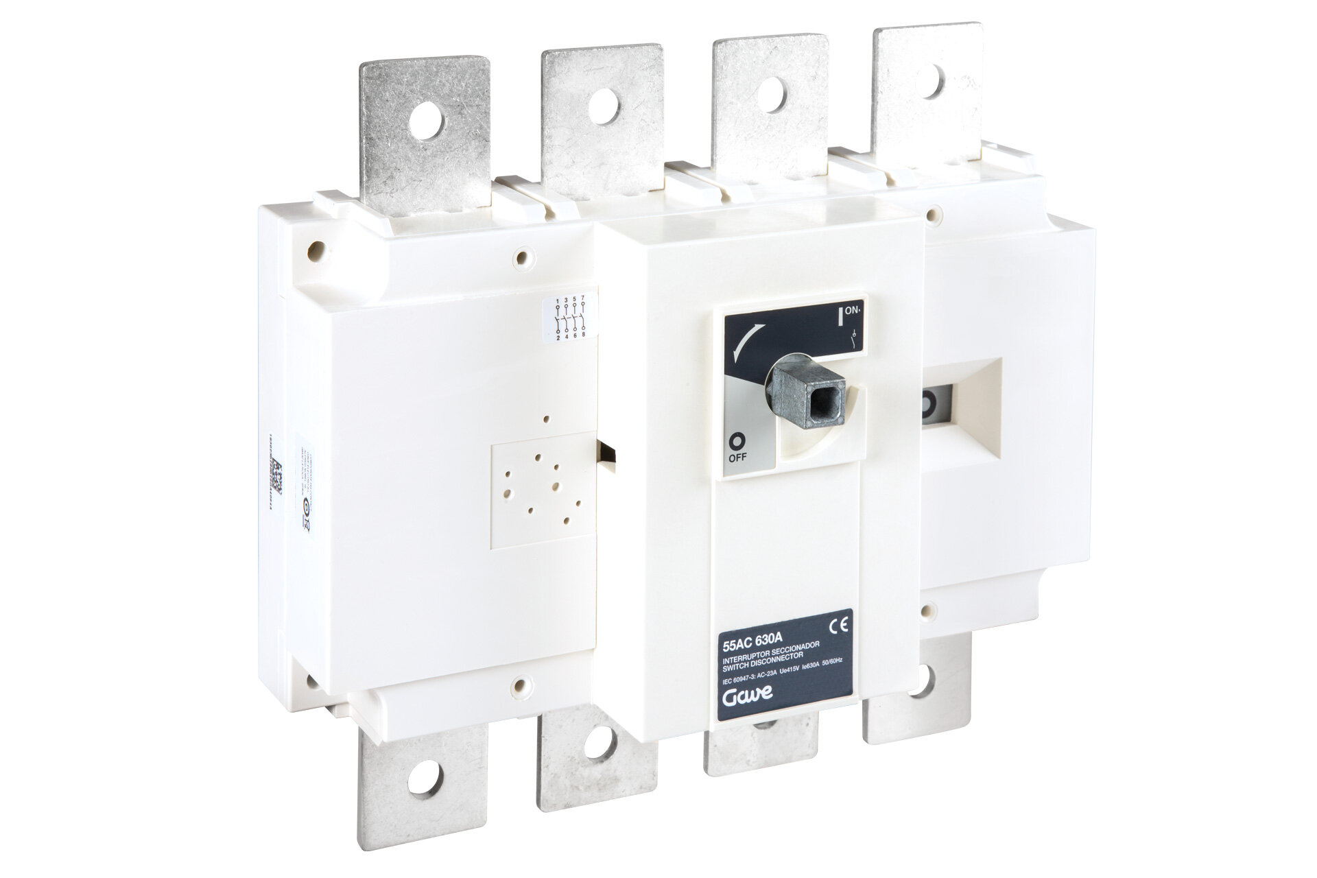 Interruptor-seccionador en carga de la serie 55AC de 4 polos 630A. Tamaño B5 de medidas 260x290x110. Opera en cargas AC-23A 415V y cargas DC-21 500V. Corte plenamente aparente. Las altas prestaciones de los materiales utilizados le confieren una alta resistencia térmica y dinámica. Suministrado sin mando se puede utilizar con múltiples tipos de mandos y múltiples accesorios como ejes prolongados, pantallas de separación o protección y contactos auxiliares.
