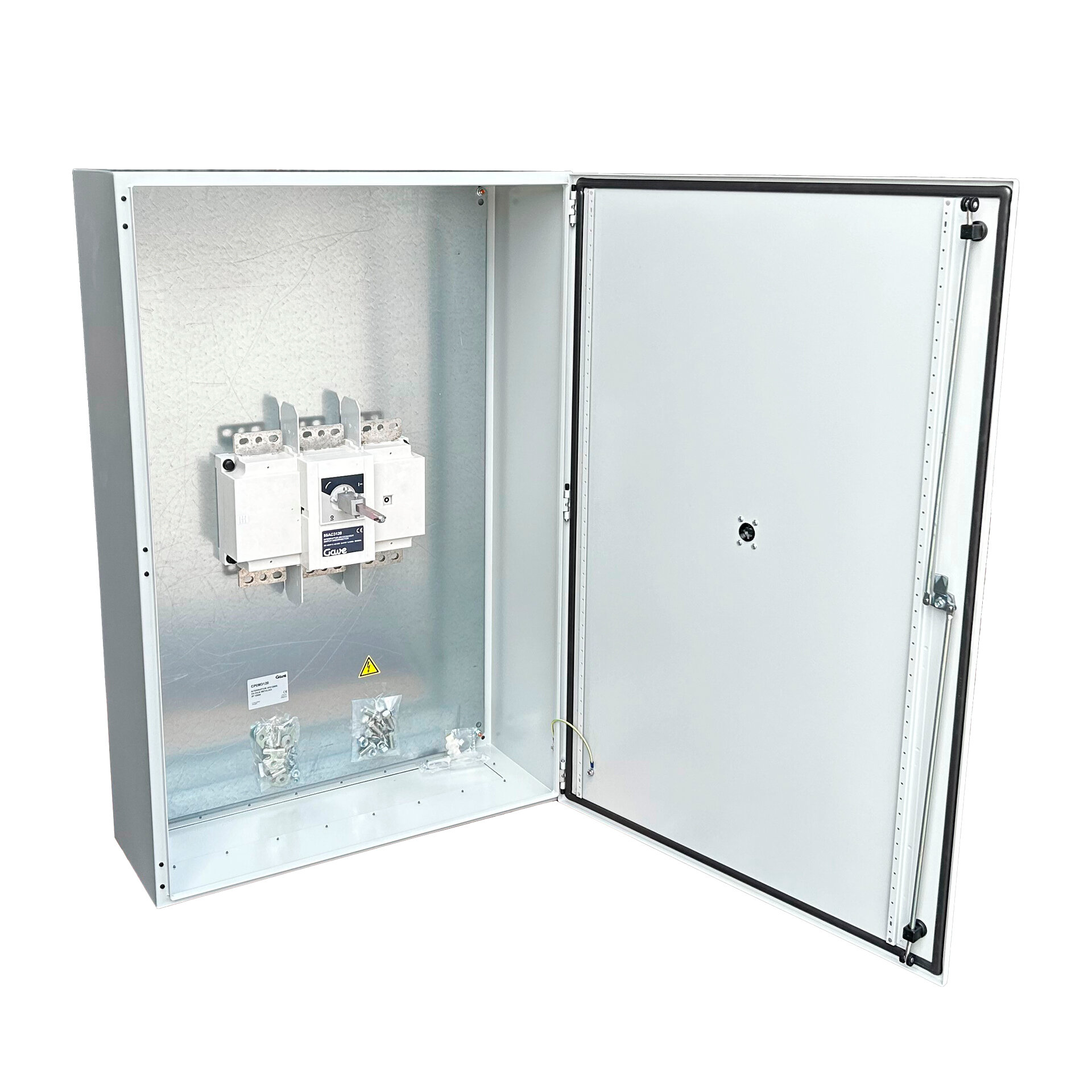 Interruptor-seccionador 3 polos 1250A en envolvente tamaño 1200x800x300 en chapa metálica y tratamiento de pintura protectora contra la corrosión color RAL7035. Accionamiento frontal exterior mediante mando de seguridad bloqueable por candados en posición 0. Interbloqueo para evitar la apertura dela envolvente bajo carga. Corte plenamente aparente. Grado de protección IP66 para la caja e IP55 para el mando. Elevada resistencia a los golpes IK10.
