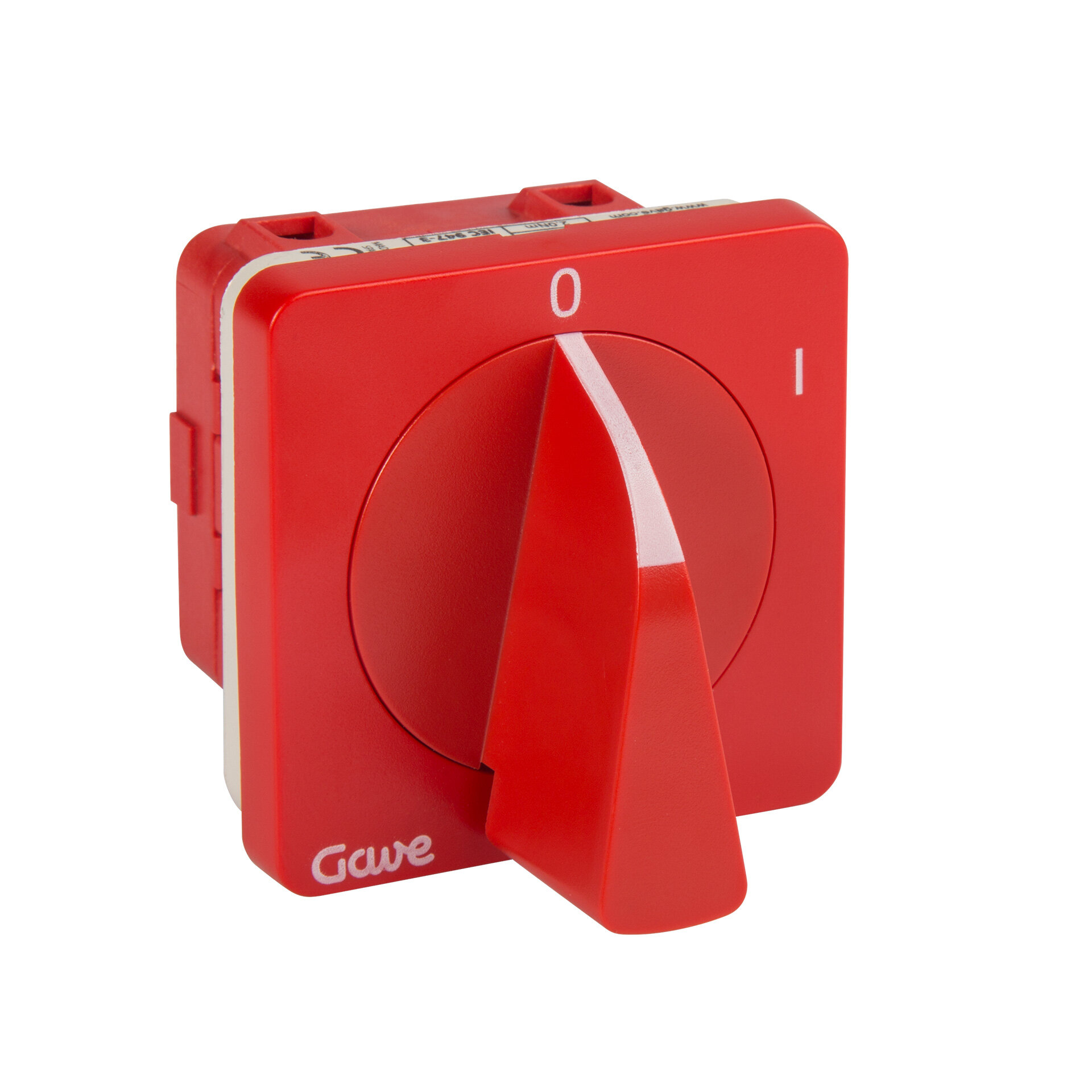 Interruptor-seccionador de levas , IP20 con carátula 0-1 color rojo 64x64 para fijación panel. 1 polo 25A.Tamaño D1. Mando ergonómico de montaje rápido sin tornillos. Conexionado con bornes de jaula para cable 6-16 mm². Compatible con múltiples accesorios de la serie A5.