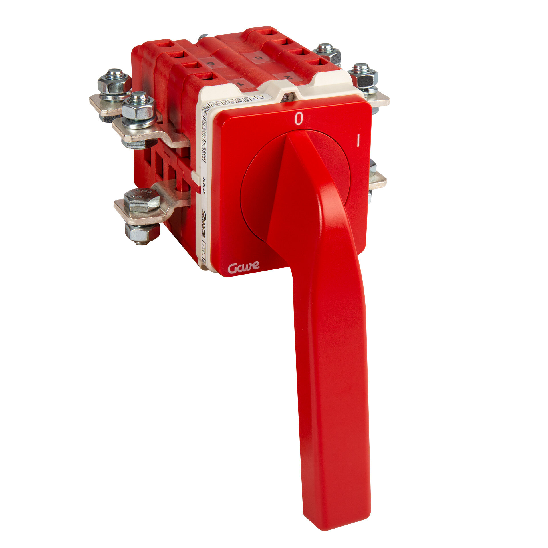 Interruptor-seccionador de levas , IP20 con carátula 0-1 color rojo 64x64 para fijación panel. 3 polo 250A.Tamaño D3. Mando ergonómico de montaje rápido sin tornillos. Conexionado por pletinas para cable 120 mm². Compatible con múltiples accesorios de la serie A5.