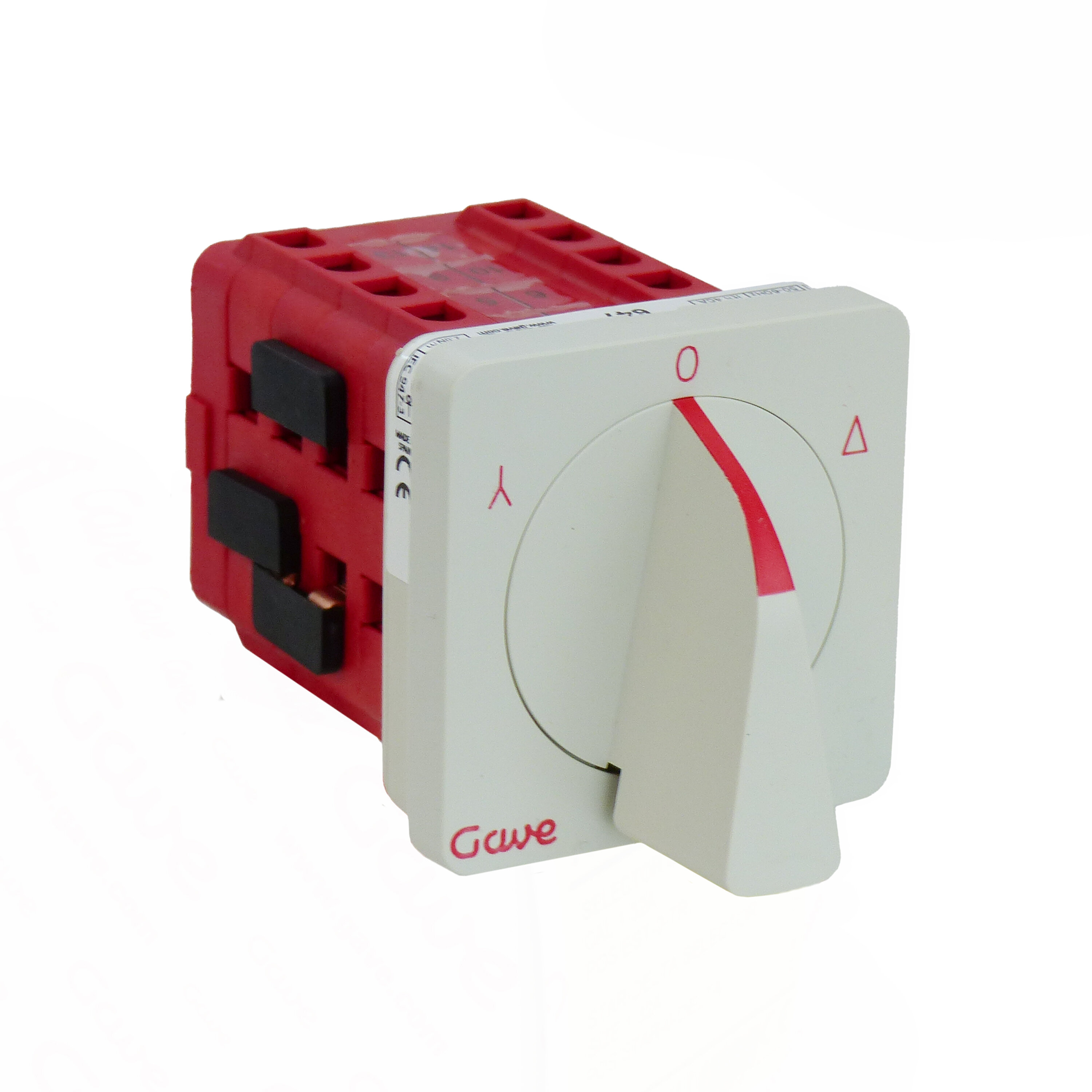 Selector de levas estrella o triángulo , IP20 con carátula Y-0-Δ color gris 64x64 para fijación panel, 40A.Tamaño D1. Mando ergonómico de montaje rápido sin tornillos. Conexionado con bornes de jaula para cable 6-16 mm². Compatible con múltiples accesorios de la serie A5.