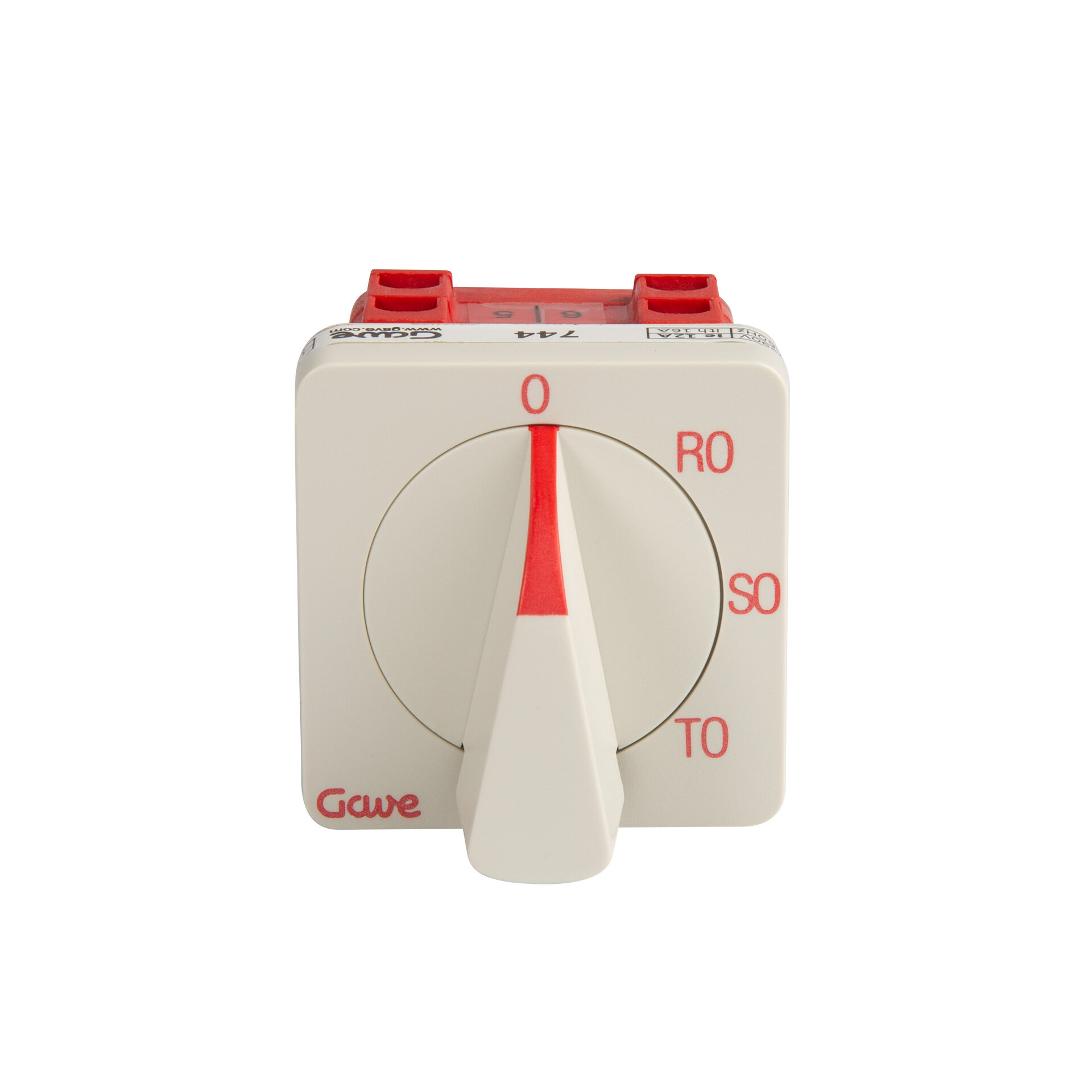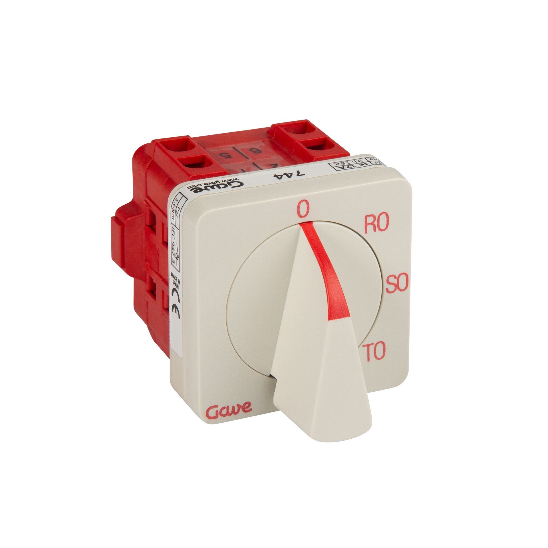 Conmutador de voltimetro tres fases y neutro, IP20 con carátula 0-R0-S0-T0 color gris 48x48 para fijación panel. 3+N polos 25A.Tamaño D0. Mando ergonómico de montaje rápido sin tornillos. Conexionado con bornes de jaula para cable 2,5-6 mm². Compatible con múltiples accesorios de la serie A5.