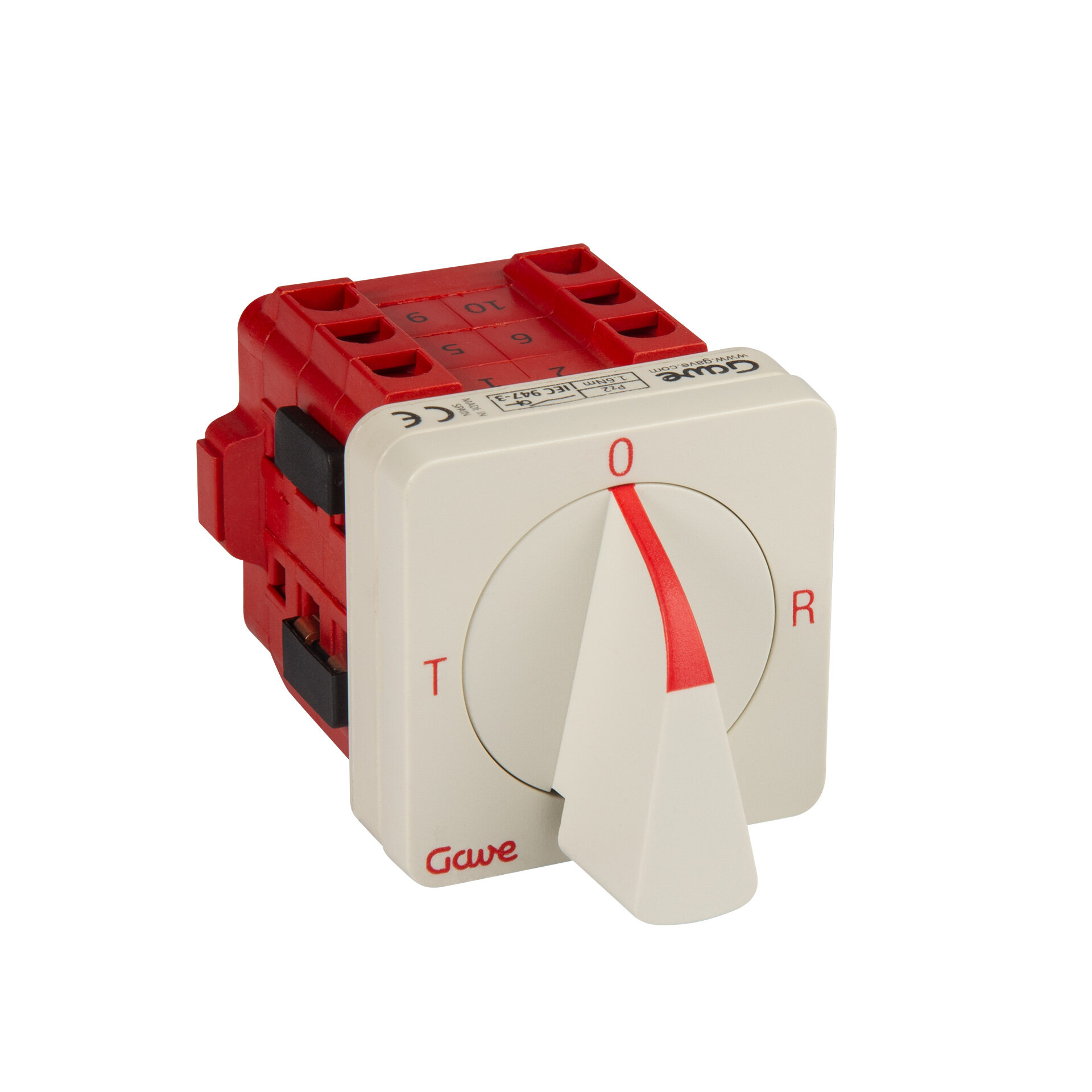 Conmutador de amperimetro 3 circuitos (con transformador) , IP20 con carátula 0-R-S-T color gris 48x48 para fijación panel. 12A.Tamaño D0. Mando ergonómico de montaje rápido sin tornillos. Conexionado con bornes de jaula para cable 2,5-6 mm². Compatible con múltiples accesorios de la serie A5.
