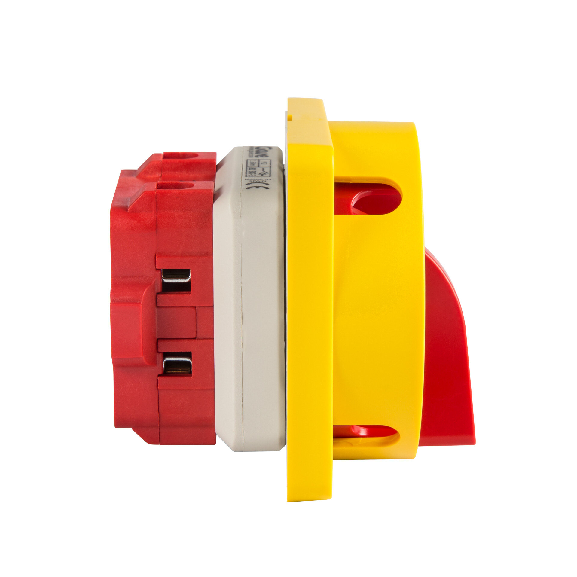 Interruptor de levas con mando de seguiridad bloqueable por candados con tratamiento antimicrobiano. Mando rojo/carátula amarilla 64x64 para fijación panel. 2 polos 12A.Tamaño D0. Mando ergonómico de montaje rápido sin tornillos. Conexionado con bornes de jaula para cable 2,5-6 mm². Compatible con múltiples accesorios de la serie A5.