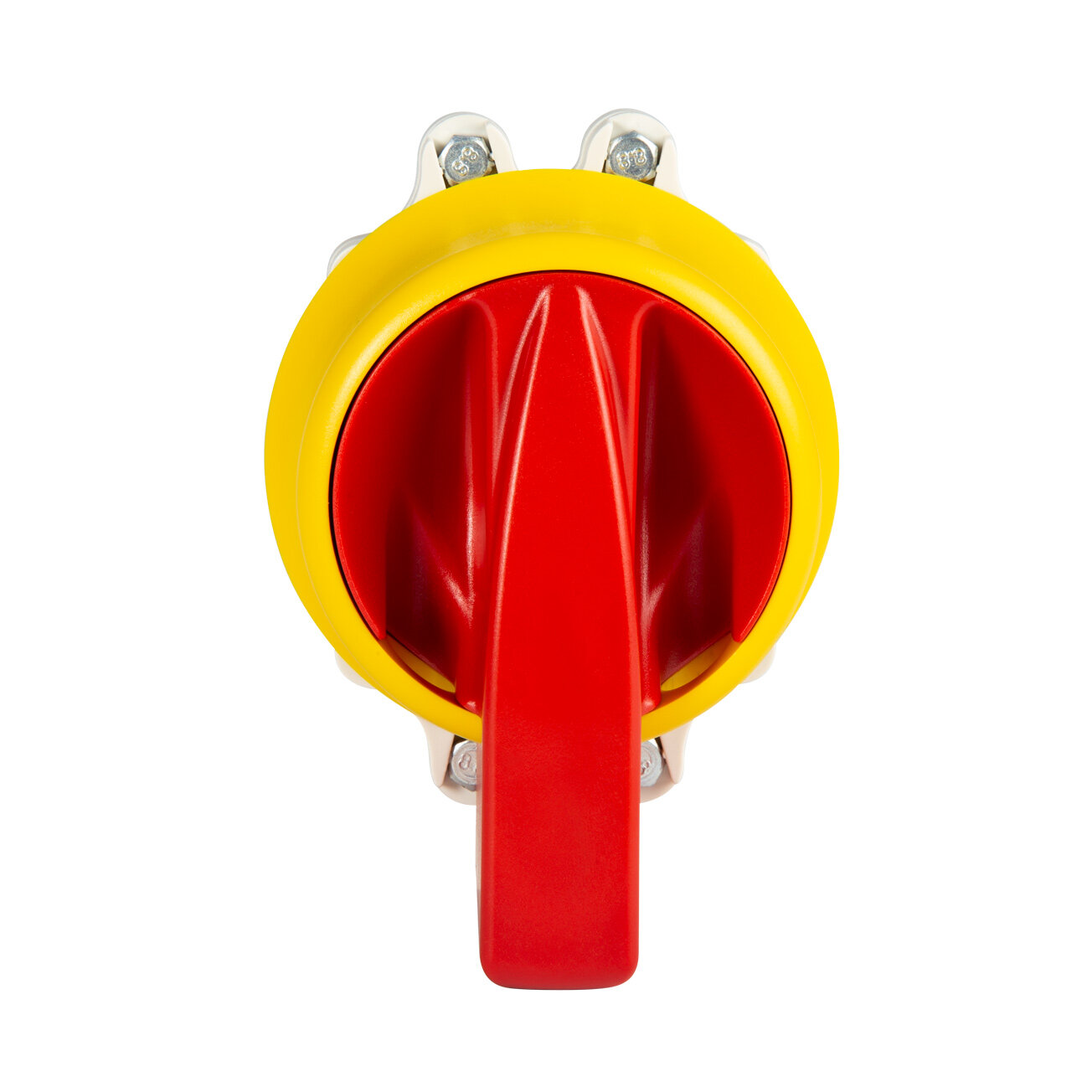 Interruptor de levas con mando de seguridad IP69K bloqueable por candados. Mando rojo/carátula amarilla con marcaje 0-I (0 12h - 60º). Mando con diseño higiénico y uso de tecnología antimicrobiana. Cuerpo del interruptor IP20. Corte omnipolar 2 polos 25A.Tamaño D0. Conexionado con bornes de jaula para cable 2,5-6 mm².