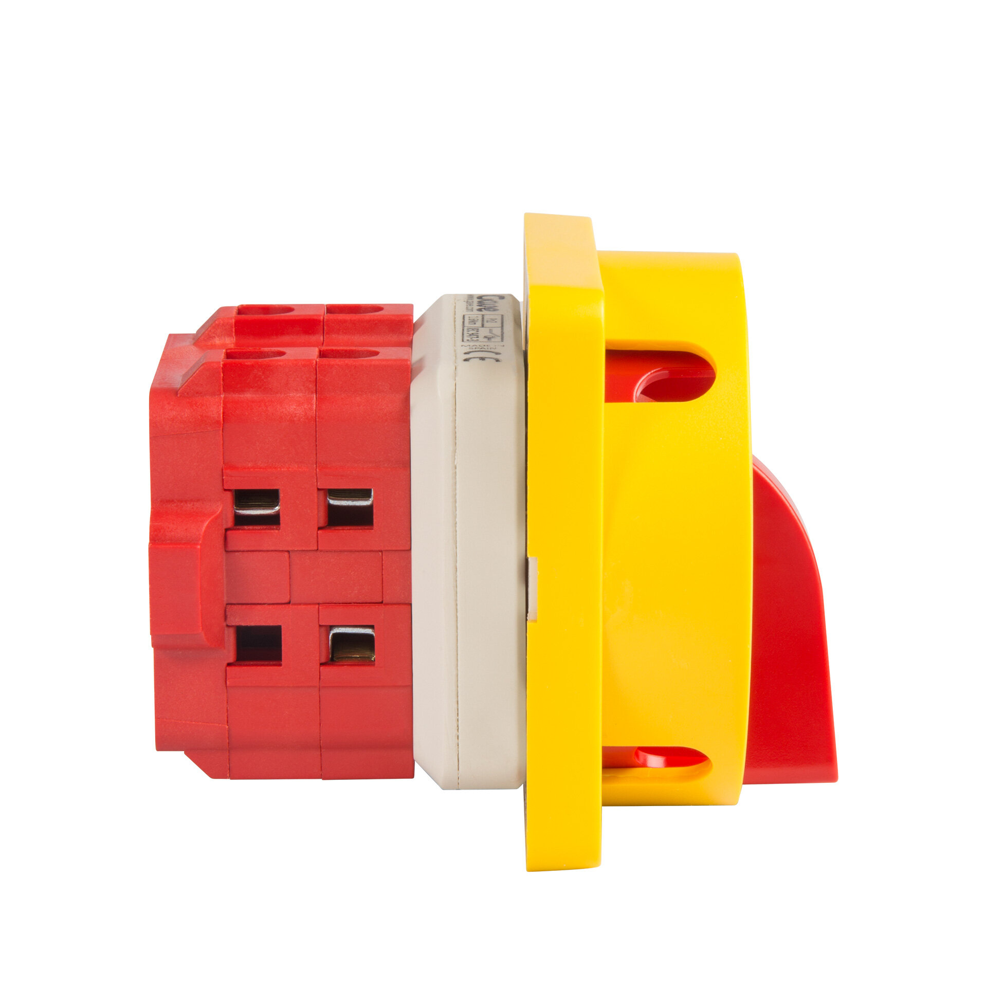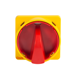 Interruptor de levas con mando de seguiridad bloqueable por candados , IP20 con mando rojo/carátula amarilla 64x64 para fijación panel. 3 polos 16A.Tamaño D0. Mando ergonómico de montaje rápido sin tornillos. Conexionado con bornes de jaula para cable 2,5-6 mm². Compatible con múltiples accesorios de la serie A5.