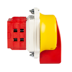 Interruptor de levas con mando de seguridad IP69K bloqueable por candados. Mando rojo/carátula amarilla con marcaje 0-I (0 12h - 60º). Mando con diseño higiénico y uso de tecnología antimicrobiana. Cuerpo del interruptor IP20. Corte omnipolar 3 polos 32A.Tamaño D1. Conexionado con bornes de jaula para cable 6-16 mm².