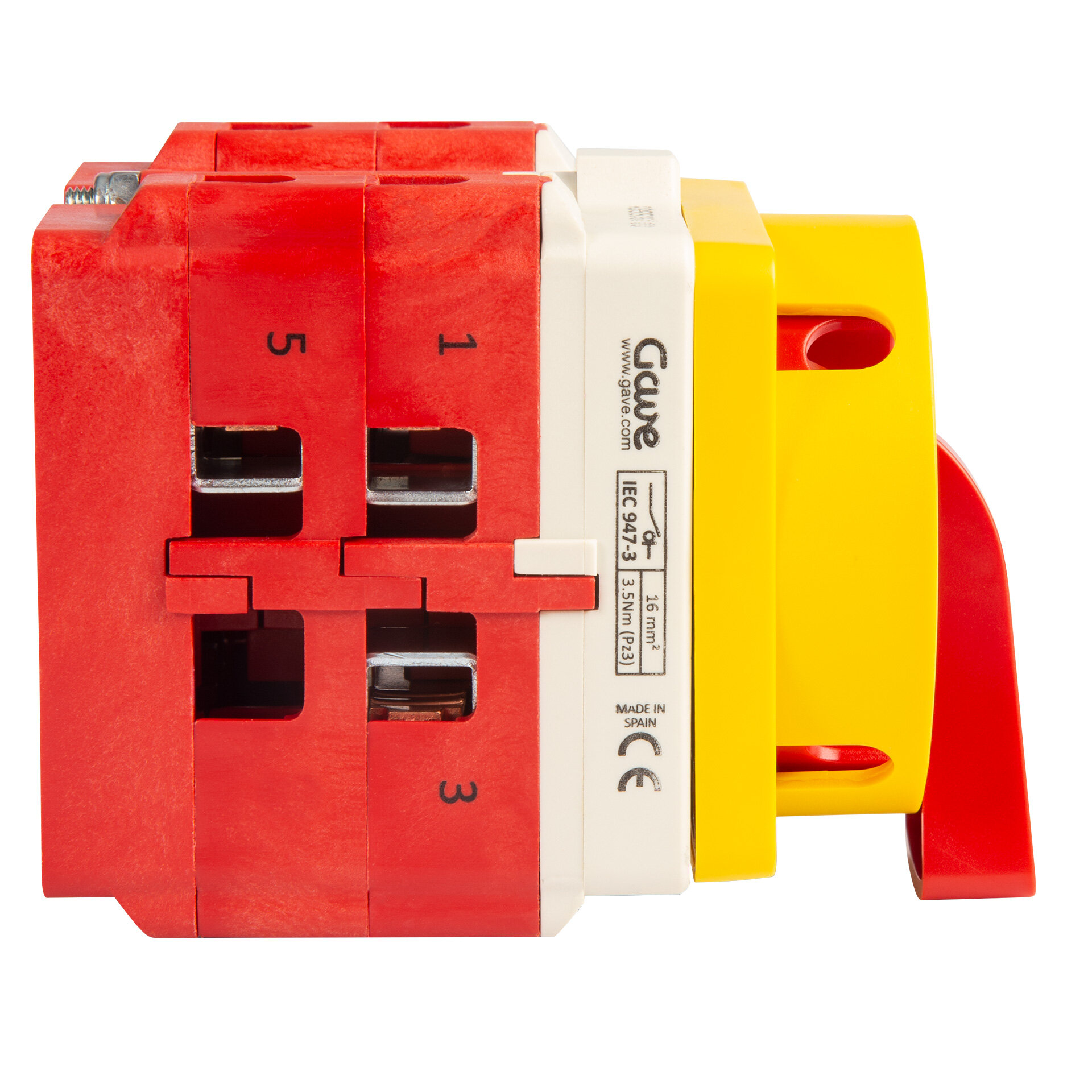Interruptor de levas con mando de seguiridad bloqueable por candados , IP20 con mando rojo/carátula amarilla 64x64 para fijación panel. 3 polos 63A.Tamaño D2. Mando ergonómico de montaje rápido sin tornillos. Conexionado con bornes de jaula para cable 16-50 mm². Compatible con múltiples accesorios de la serie A5.