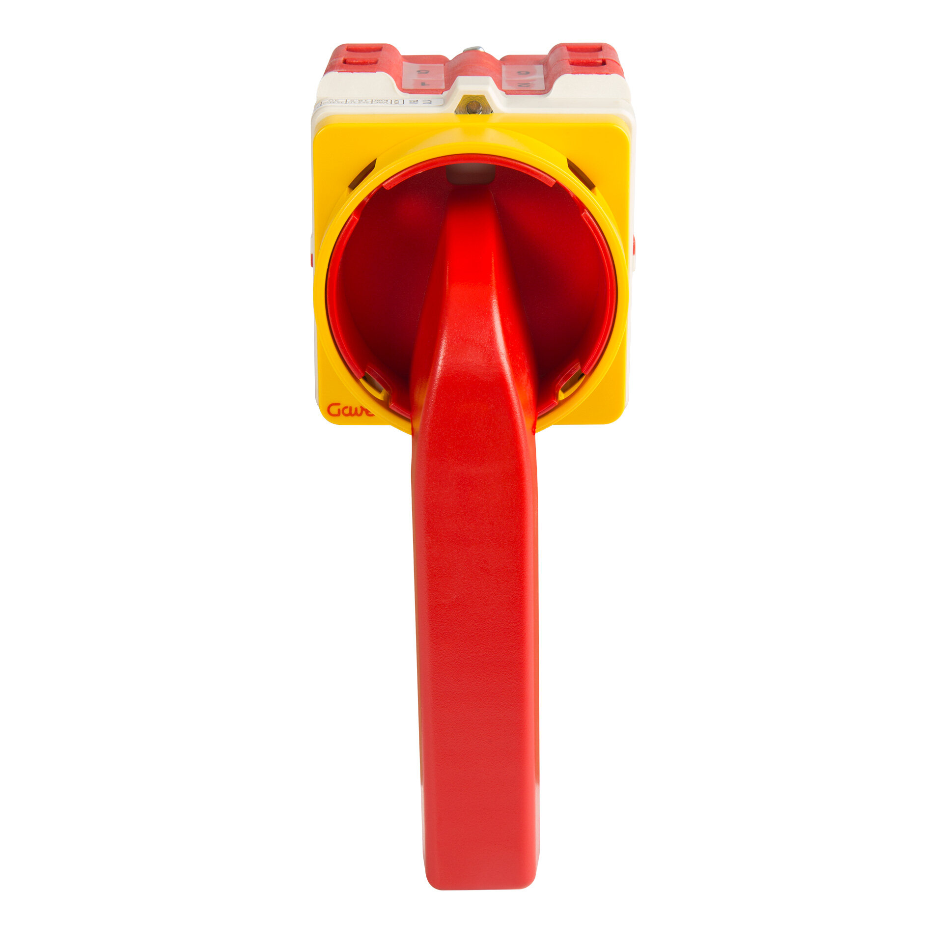Interruptor de levas con mando de seguiridad bloqueable por candados , IP20 con mando rojo/carátula amarilla 64x64 para fijación panel. 3 polos 125A.Tamaño D2. Mando ergonómico de montaje rápido sin tornillos. Conexionado con bornes de jaula para cable 16-50 mm². Compatible con múltiples accesorios de la serie A5.