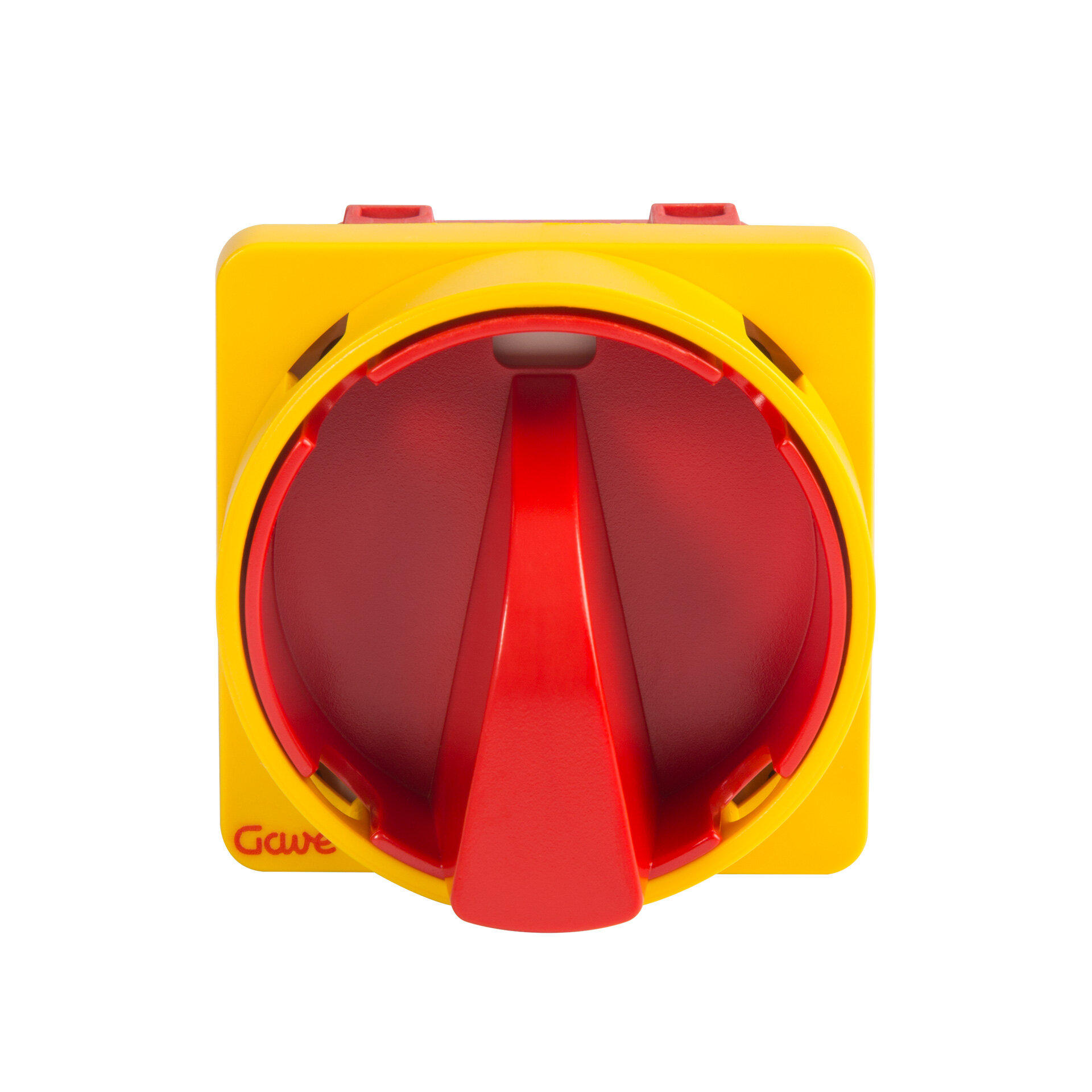 Interruptor de levas con mando de seguiridad bloqueable por candados , IP20 con mando rojo/carátula amarilla 64x64 para fijación panel. 4 polos 25A.Tamaño D1. Mando ergonómico de montaje rápido sin tornillos. Conexionado con bornes de jaula para cable 6-16 mm². Compatible con múltiples accesorios de la serie A5.