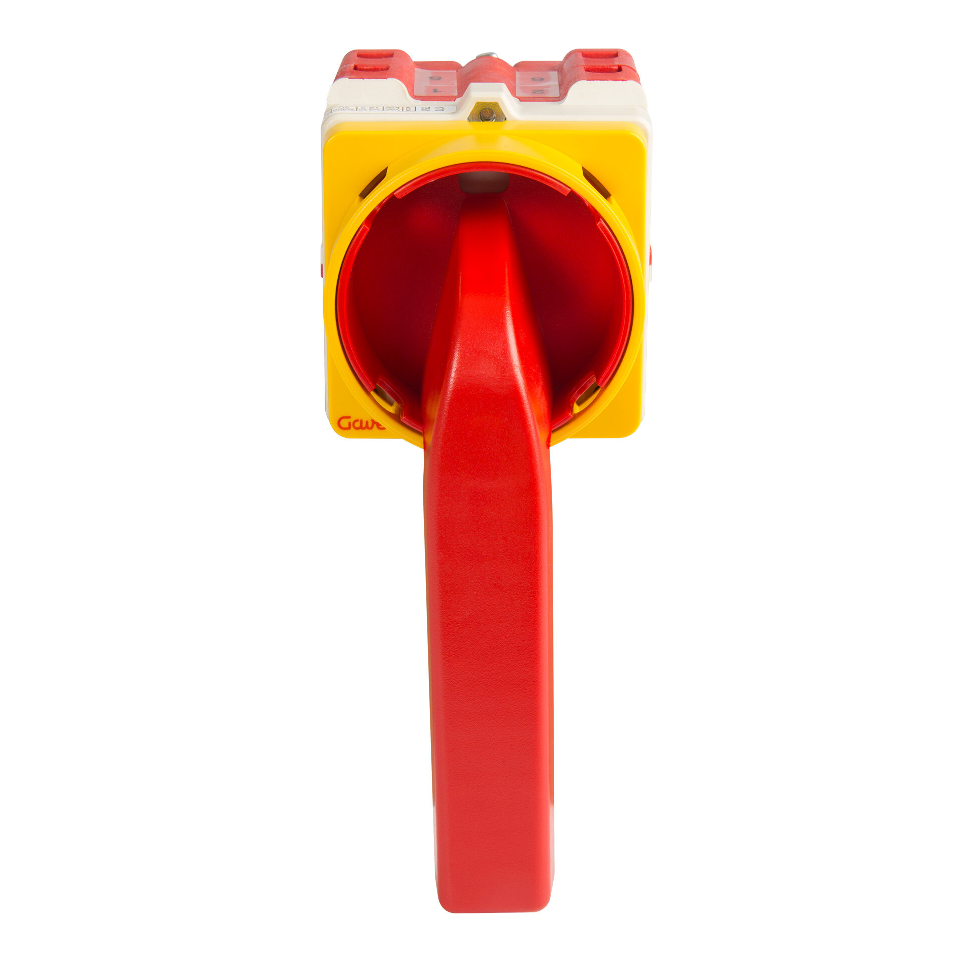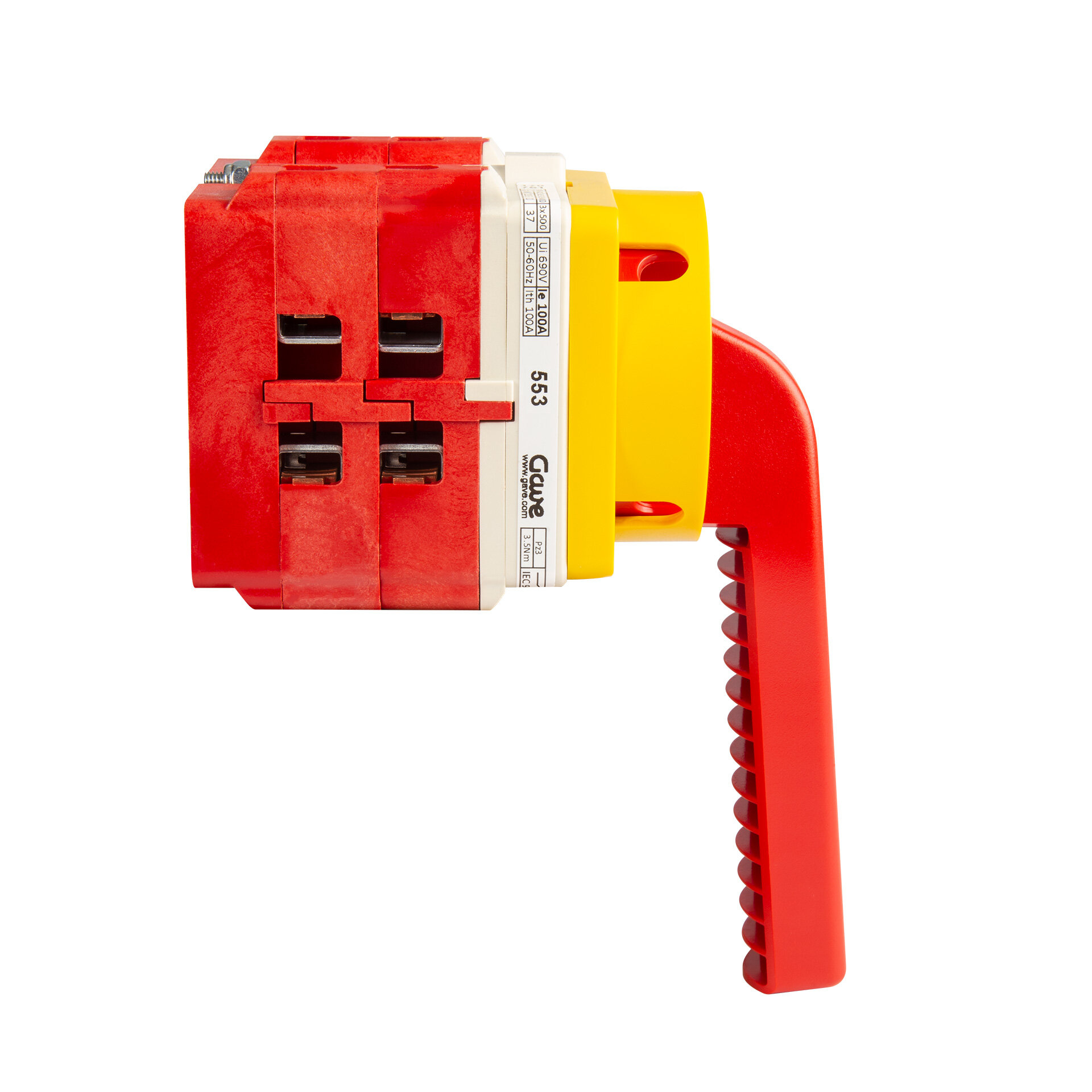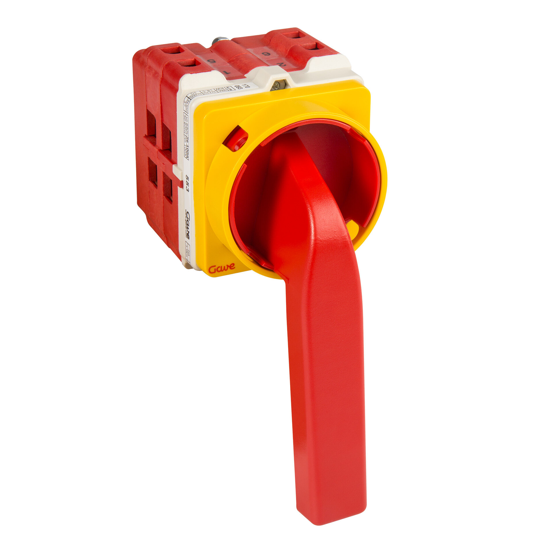 Interruptor de levas con mando de seguiridad bloqueable por candados , IP20 con mando rojo/carátula amarilla 64x64 para fijación panel. 4 polos 125A.Tamaño D2. Mando ergonómico de montaje rápido sin tornillos. Conexionado con bornes de jaula para cable 16-50 mm². Compatible con múltiples accesorios de la serie A5.