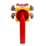 Interruptor de levas con mando de seguiridad bloqueable por candados , IP20 con mando rojo/carátula amarilla 64x64 para fijación panel. 4 polos 200A.Tamaño D3. Mando ergonómico de montaje rápido sin tornillos. Conexionado por pletinas para cable 95 mm². Compatible con múltiples accesorios de la serie A5.