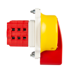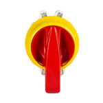 Interruptor de levas con mando de seguridad IP69K bloqueable por candados. Mando rojo/carátula amarilla con marcaje 0-I (0 12h - 60º). Mando con diseño higiénico y uso de tecnología antimicrobiana. Cuerpo del interruptor IP20. Corte omnipolar 4 polos 25A + contacto auxiliar simultaneo 1NA+1NC de 12A. Tamaño D0. Conexionado con bornes de jaula para cable 2,5-6 mm².
