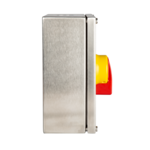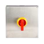 Interruptor de seguridad IP69K 3 polos 63A en caja de acero inoxidable IP65. Caja 3IN en inox 316L con acabado electropulido adecuado para entornos altamente corrosivos o con exigencias higiénicas, medidas 250x250x110. Entrada superior y salida inferior M40. Fijación a superfície por 4 puntos. Mando rojo/amarillo bloqueable por candados (hasta 4 de 8mm de diámetro). Conexionado con bornes de jaula para cable 16-50 mm². Accesoriable con prensaestopas y tapones IP66.