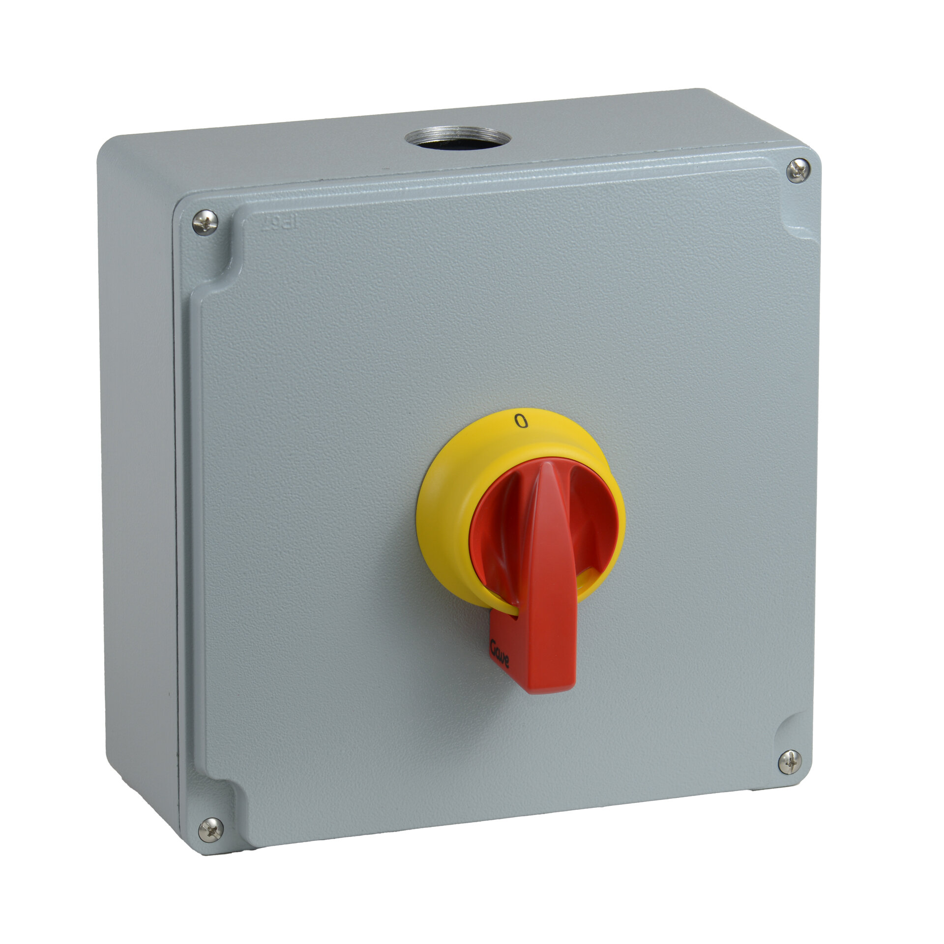 Interruptor de seguridad IP69K 3 polos 100 A en caja de aluminio. Caja 4AL en aluminio color gris RAL7040 con superfície de acabado rugoso tratada para resistir a la corrosión, medidas 250x250x111. Grado de protección IP65. Entrada superior y salida inferior M40 agujeros roscados. Fijación a superfície por 4 puntos. Mando rojo/amarillo bloqueable por candados (hasta 4 de 8 mm de diámetro). Conexionado con bornes de jaula para cable 16-50 mm².