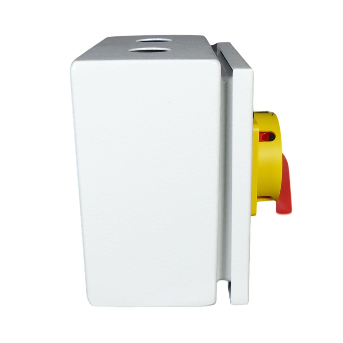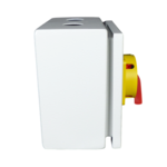 Interruptor-seccionador 3 polos 25A resistente al fuego clase F600 según EN 12101-3. Caja 1AC en aluminio color gris RAL7035 con superfície tratada para resistir a la corrosión, medidas 150x150x95. Grado de protección IP65. 2 entradas superiores y 2 salidas inferiores M25. Fijación a superfície por 4 puntos. Mando rojo/amarillo bloqueable por candados (hasta 4 de 8mm de diámetro). Conexionado con bornes de jaula para cable 6-16 mm².