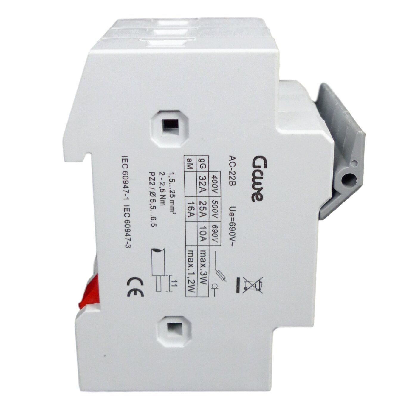 Portafusible formato modular 3 polos. Tamaño 0 10x38 para tensiones hasta 690 Vdc 32 A, DC-20. Materiales plásticos autoextinguibles resistentes a los choques de temperatura. 3 módulos de ancho. Conexionado por bornes de jaula 1,5-25 mm2.