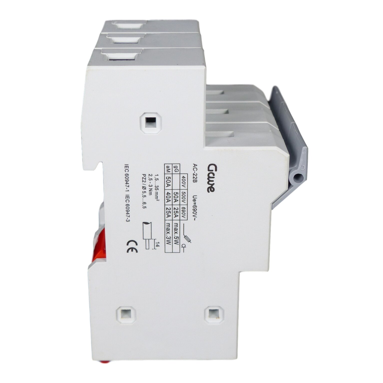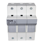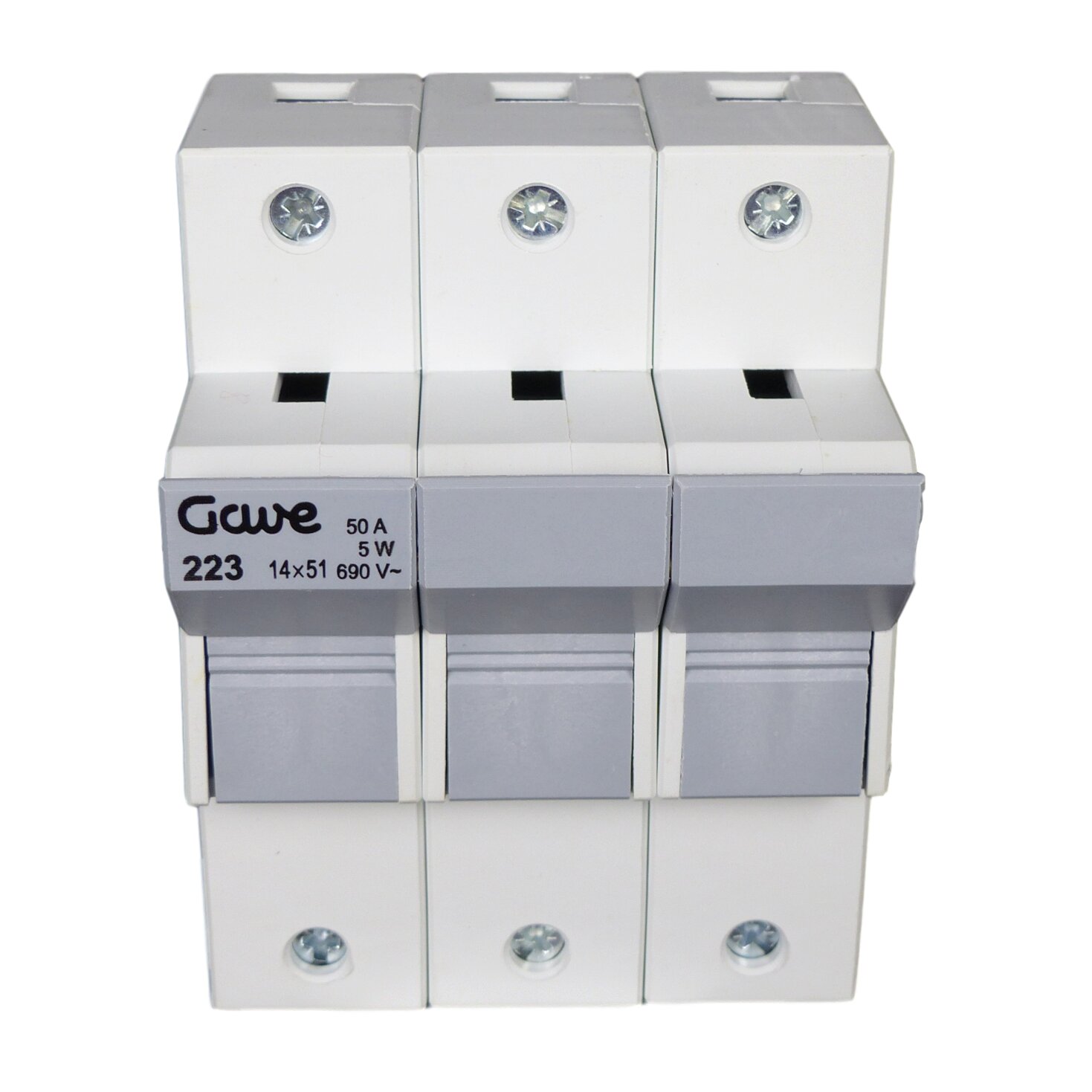 Portafusible formato modular 3 polos. Tamaño 1 14x51 para tensiones hasta 690 Vdc 50 A. Materiales plásticos autoextinguibles resistentes a los choques de temperatura. 3 módulos de ancho. Conexionado por bornes de jaula 1,5-35 mm2.