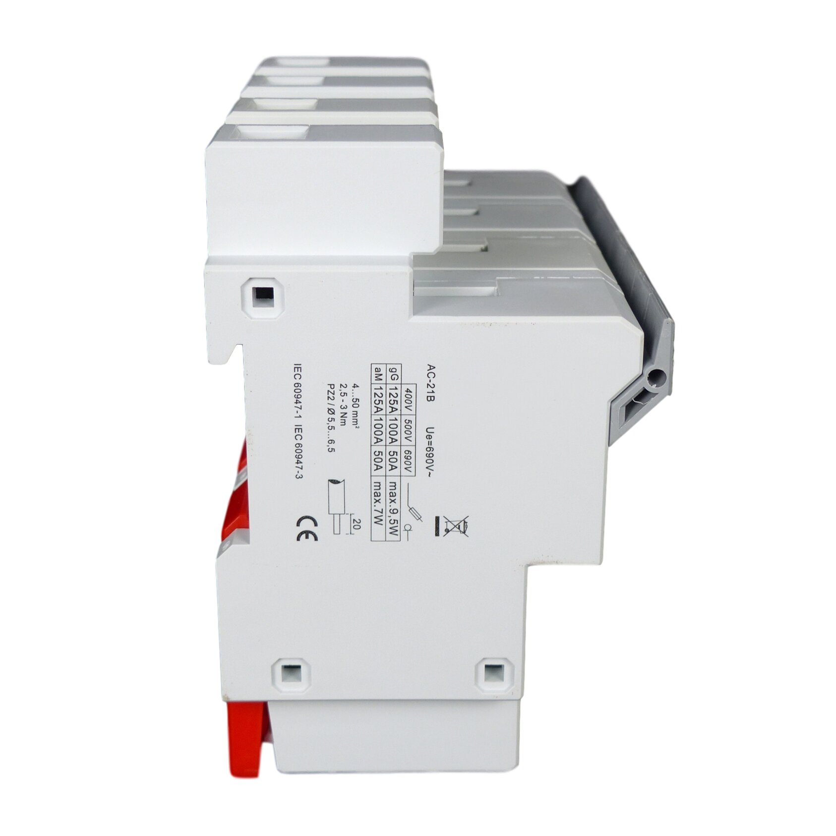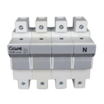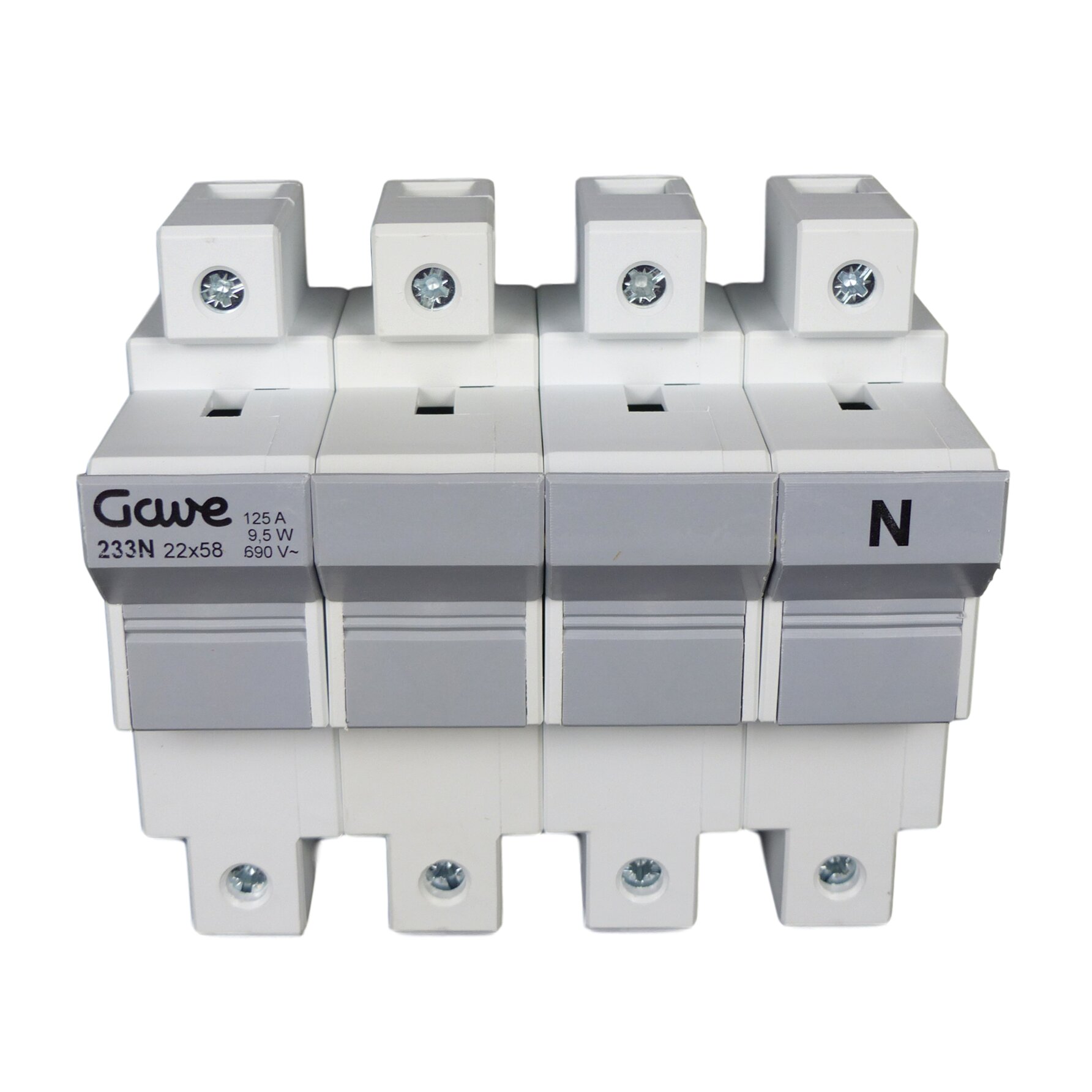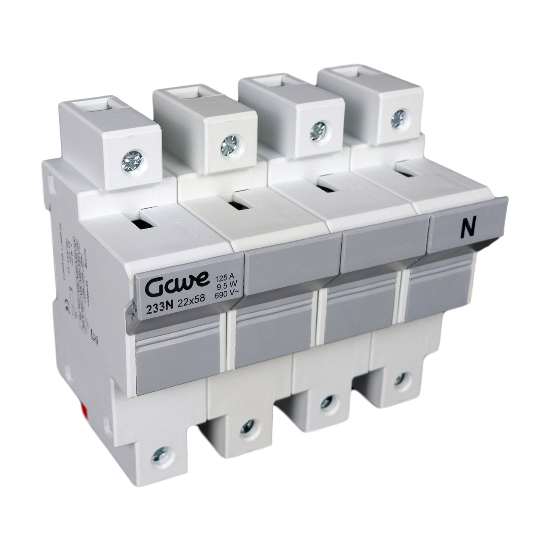 Portafusible formato modular 3 polos + neutro. Tamaño 2 22x58 para tensiones hasta 690 Vdc 100 A. Materiales plásticos autoextinguibles resistentes a los choques de temperatura. 4 módulos de ancho. Conexionado por bornes de jaula 4-50 mm2. Incluye cartucho de neutro.