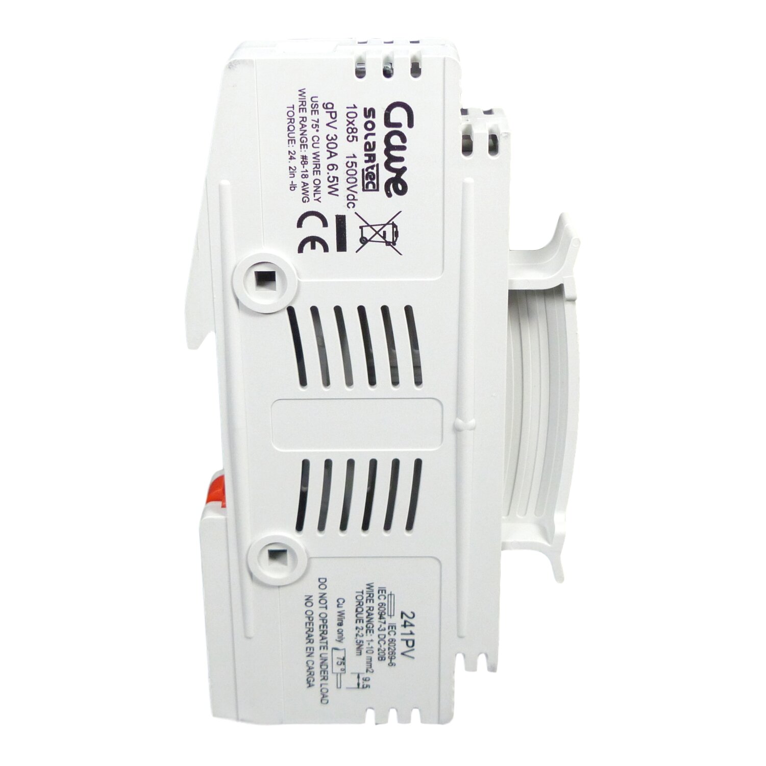 Portafusible modular 1 polo 10x85 para tensiones hasta 1500Vdc 30A DC-20. Materiales plásticos autoextinguibles resistentes a los choques de temperatura, amplias zonas de aereación. 19,5 mm de ancho. Apertura sin carga. Conexionado por bornes de jaula 1-10mm2.