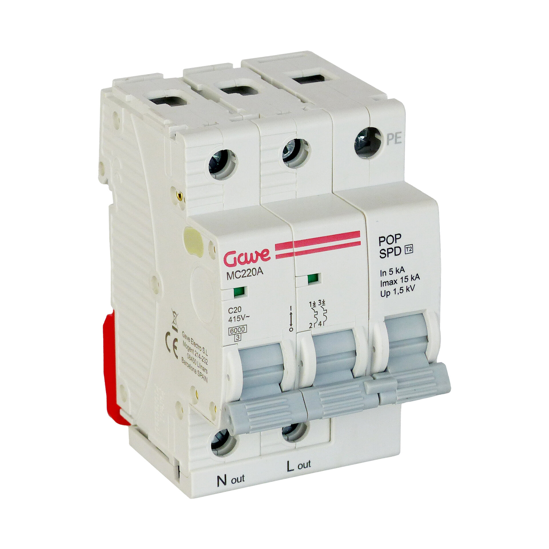 Protector combinado contra sobretensiones transitorias y permanentes, incluye interruptor magnetotérmico 1P+N (IGA) de 40A curva C 6kA (EN 60898-1). Modelo compacto en 3 módulos de fácil y rápida instalación. Protección sobretensiones permanentes POP conforme EN 50550/IEC 63052. Sobretensiones transitorias Classe II In 5kA - Imax 15 kA - Up 1,5 kV conforme IEC/EN 61643-11