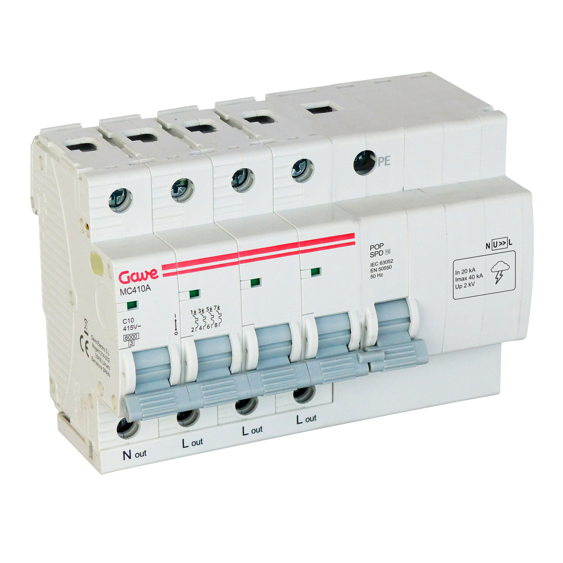 Protector combinado contra sobretensiones transitorias y permanentes, incluye interruptor magnetotérmico 3P+N (IGA) de 16A curva C 6kA (EN 60898-1). Modelo compacto en 7 módulos de fácil y rápida instalación. Protección sobretensiones permanentes POP conforme EN 50550/IEC 63052. Sobretensiones transitorias Classe II In 20kA - Imax 40 kA - Up 2 kV conforme IEC/EN 61643-11