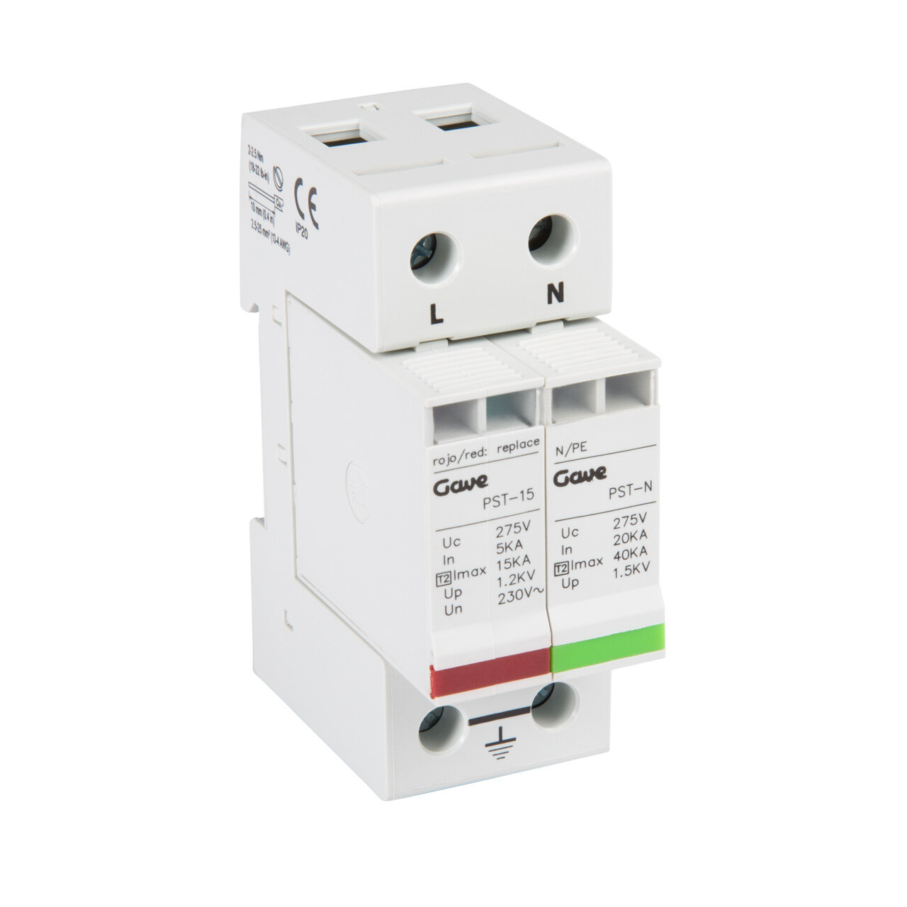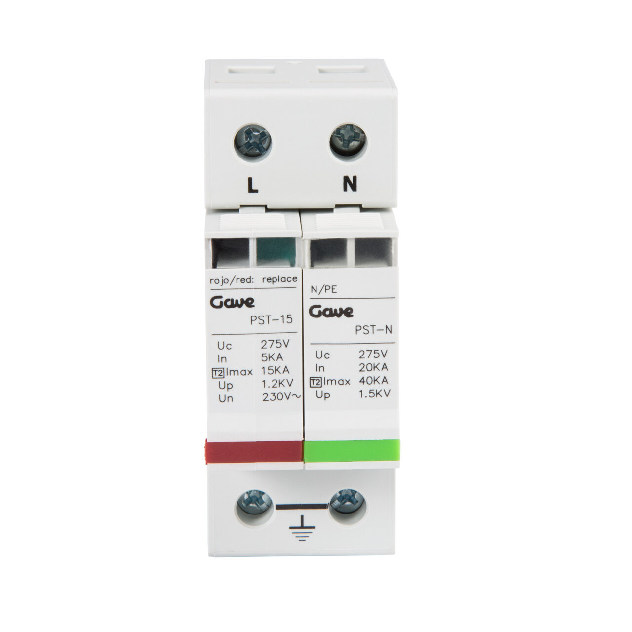 Protector de sobretensiones transitorias, provocada por aumento elevado de tensión de poca duración, Tipo II según normativa IEC 61643-11, instalación en subcuadro, alimentación 230 V AC 50Hz I+N, tecnología de varistor más descargador de gas, módulos enchufables y fácil reemplazo, régimen de neutro TT-TN, protección en modo común y diferencial, indicador visual del estado del módulo, máxima tensión residual Up 1,5 kV, intensidad máxima de descarga 15 kA, Intensidad nominal 5 kA, tensión máxima de forma permanente Uc 275V, 2 módulos de ancho y montaje en carril DIN.