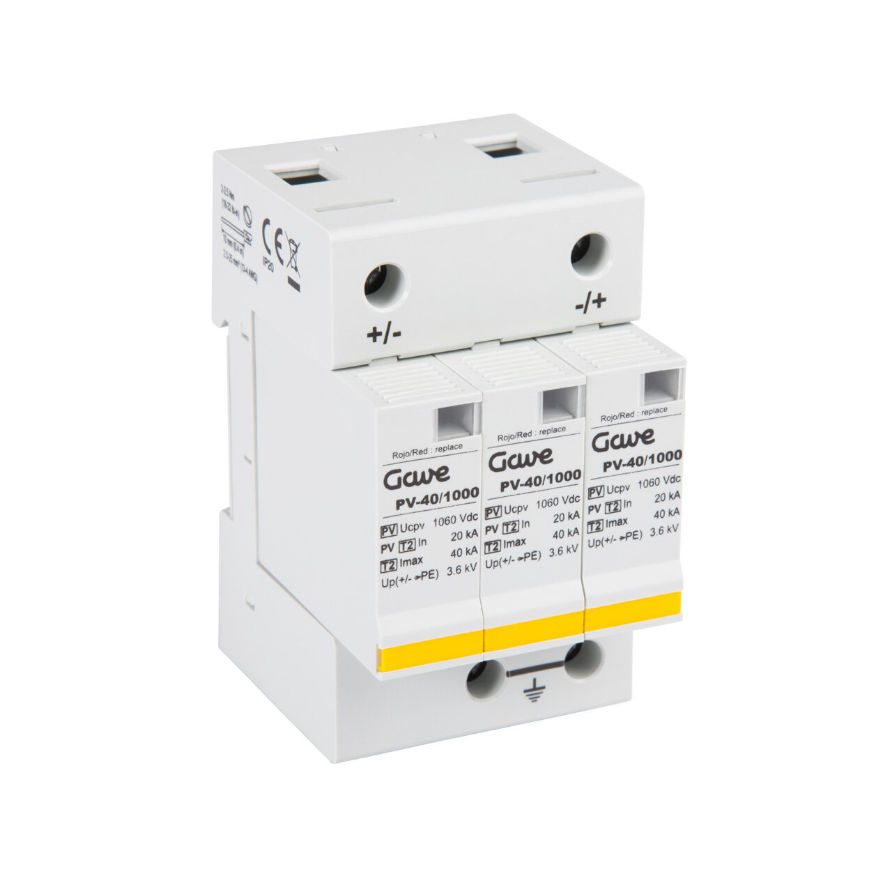 Protector de sobretensiones transitorias de corriente continua para instalaciones fotovoltaicas, Tipo II para la protección de los equipos fotovoltaicos contra tensiones elevadas transitorias de origen atmosférico, tensión de red FV 1000 V DC, tensión máxima de régimen permanente 1060V DC, tecnología de varistor, módulos enchufables y fácil reemplazo, protección en modo común y diferencial, indicador visual del estado del módulo y teleseñalización, corriente de descarga nominal 20kA, corriente de descarga máxima 40kA, nivel de protección Up 3,6kV, 2 módulo de ancho y montaje en carril DIN.