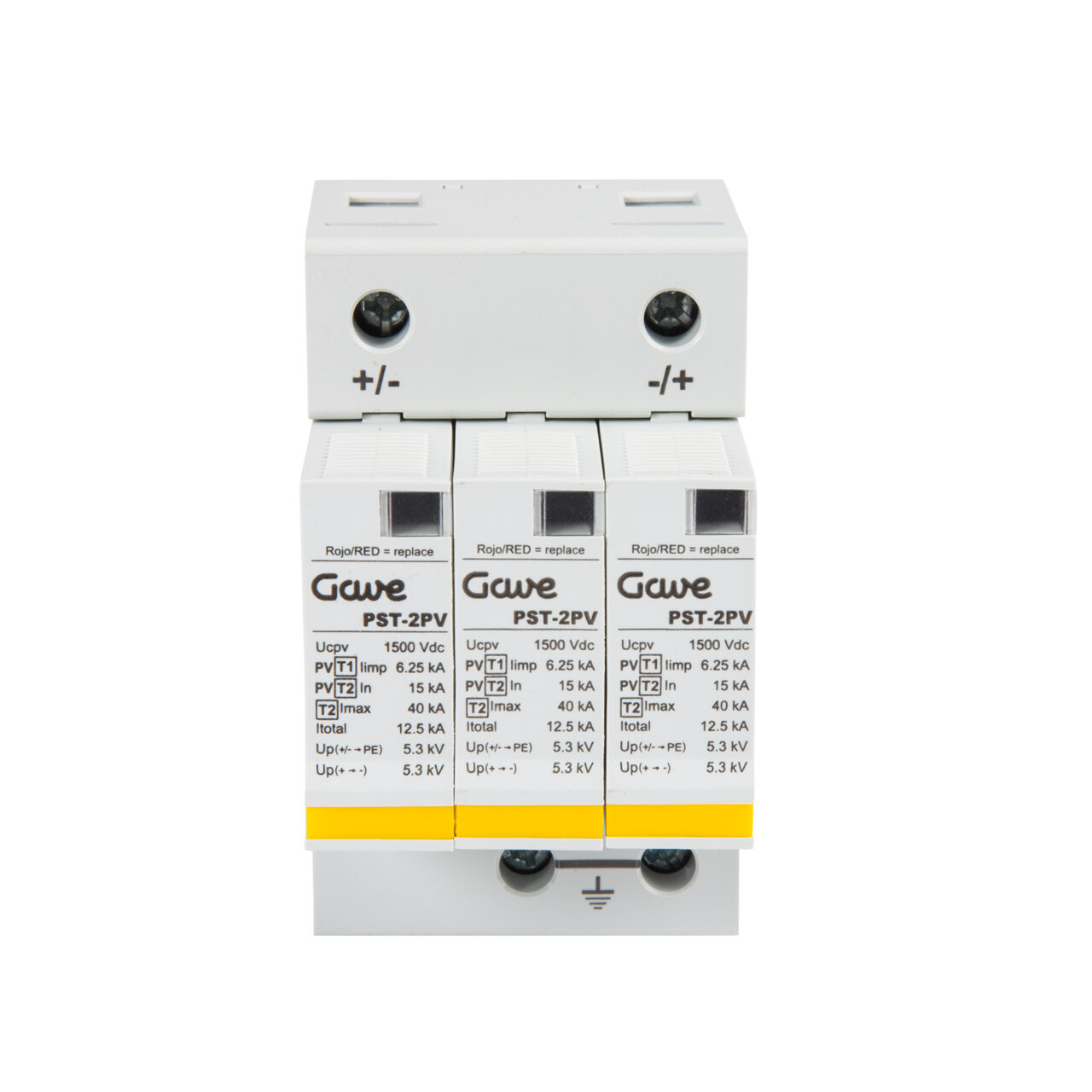 Protector de sobretensiones transitorias de corriente continua para instalaciones fotovoltaicas, Tipo I+II para la protección de los equipos fotovoltaicos contra tensiones elevadas transitorias de origen atmosférico, tensión de red FV 1250 V DC, tensión máxima de régimen permanente 1500V DC, tecnología Varistor, módulos enchufables y fácil reemplazo, protección en modo común y diferencial, indicador visual del estado del módulo, corriente de descarga nominal 15kA, corriente de descarga máxima 40kA, nivel de protección Up 5,3kV (común/diferencial), 3 módulos de ancho y montaje en carril DIN.