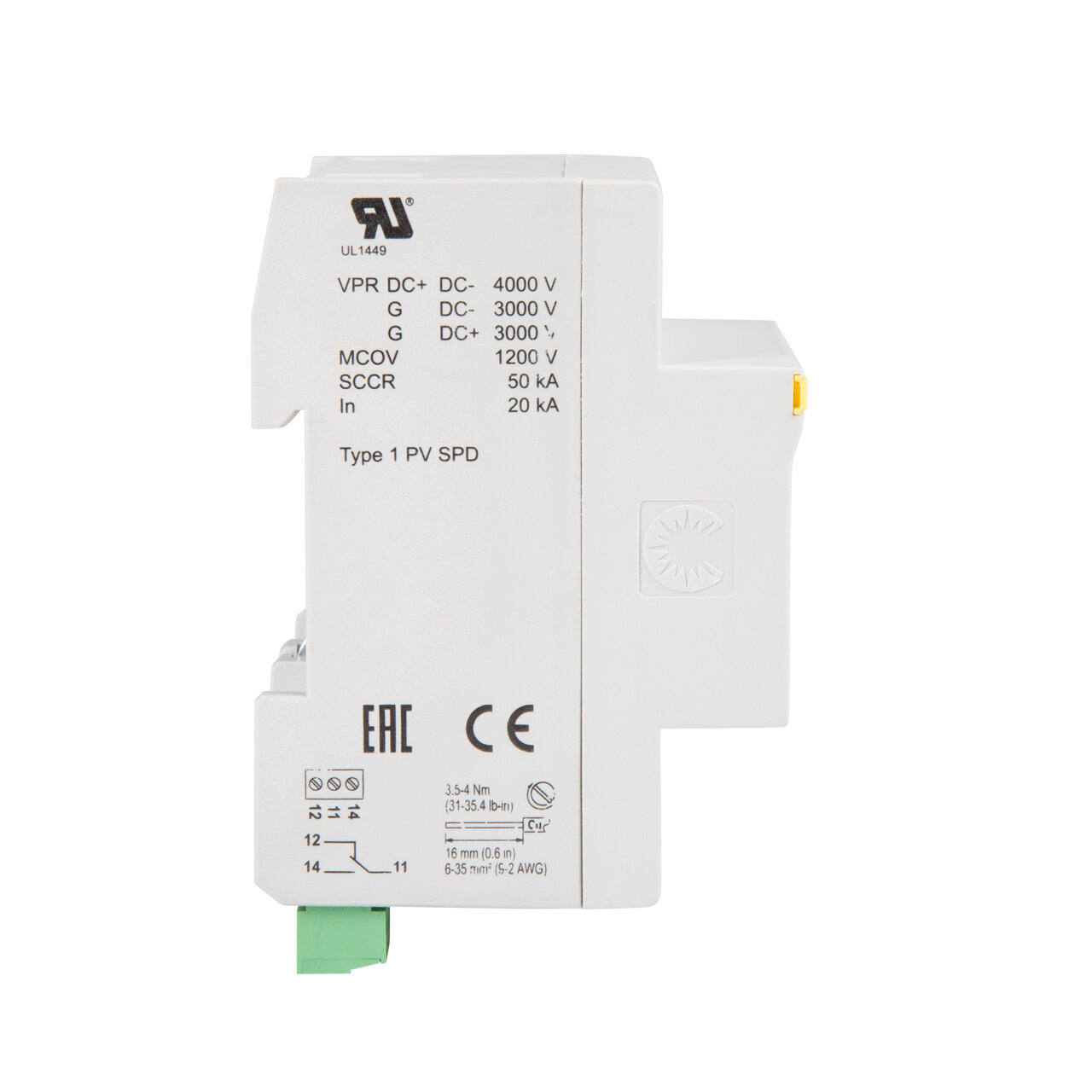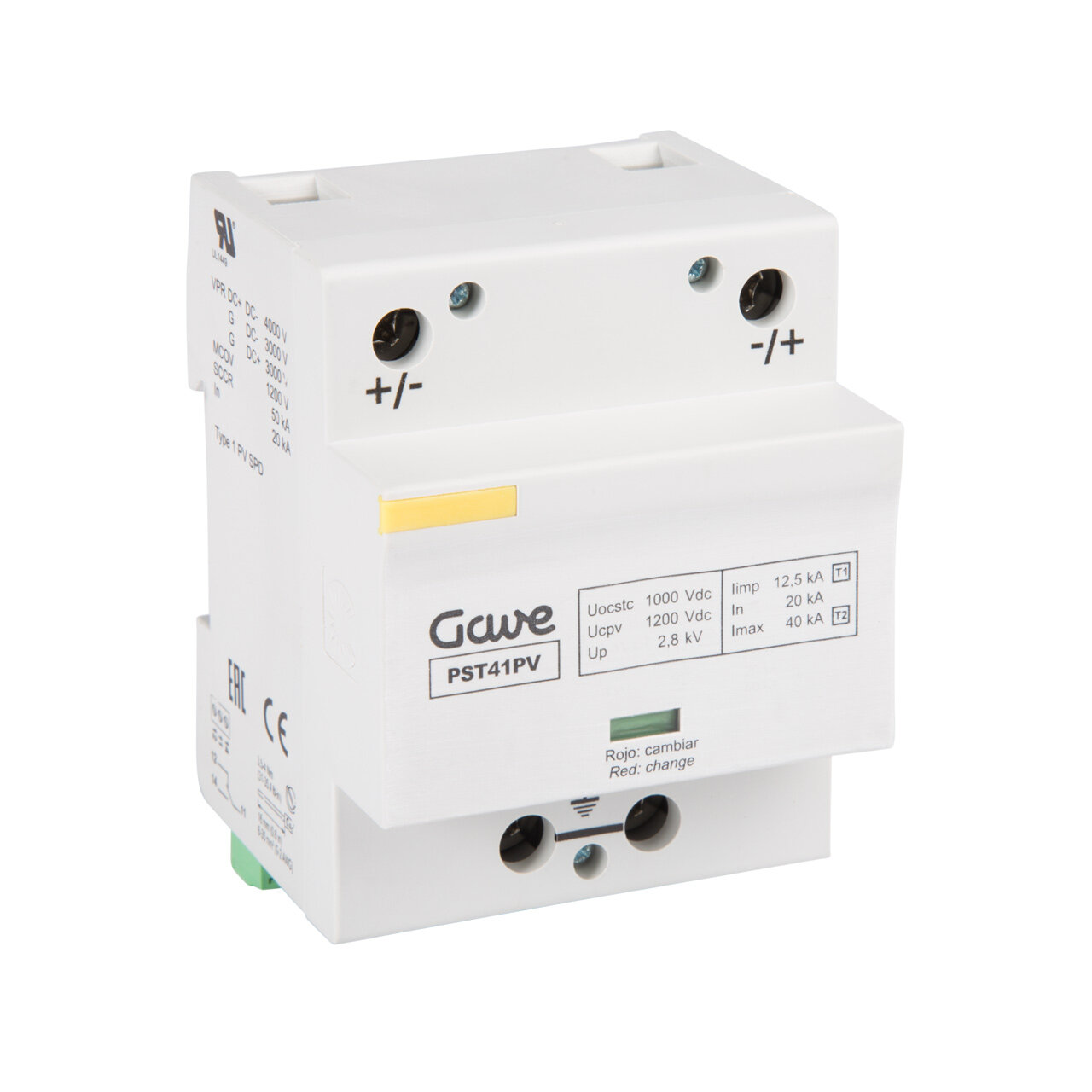 Protector de sobretensiones transitorias de corriente continua para instalaciones fotovoltaicas, Tipo I con gran capacidad de descarga, tecnología varistor-gas, tensión de red FV 1000V, tensión máxima de régimen permanente 1200V DC, resistencia a cortocircuito 1000A, corriente de descarga nominal 20kA, corriente de descarga máxima 40kA, corriente de impulso por polo 12,5 kA, corriente total de rayo 25kA, 4 módulo de ancho y montaje en carril DIN.