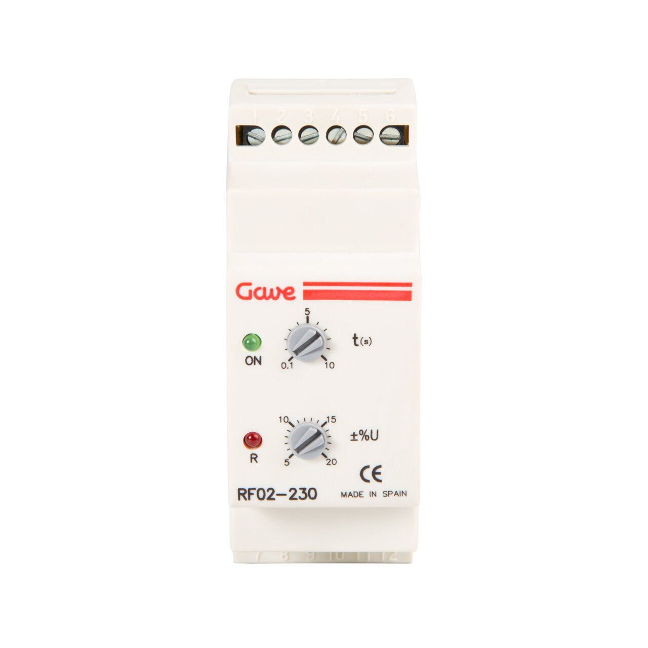 Relé de control de secuencia y fallo de fase, tensión de alimentación de 150-250V AC 50/60Hz III, detección de secuencia de fases incorrecta, detección de fallo de fase por caída de tensión entre fases ajustable de 150 a 250V, desconexión a la detección de fallo para la protección de receptores eléctricos mediante relé conmutado, poder de corte 8A /250V AC Cos?=1, tiempo de desconexión y rearme de 0,1 segundos, leds de señalización para visualizar estado de la red, 2 módulos de ancho y montaje en carril DIN.