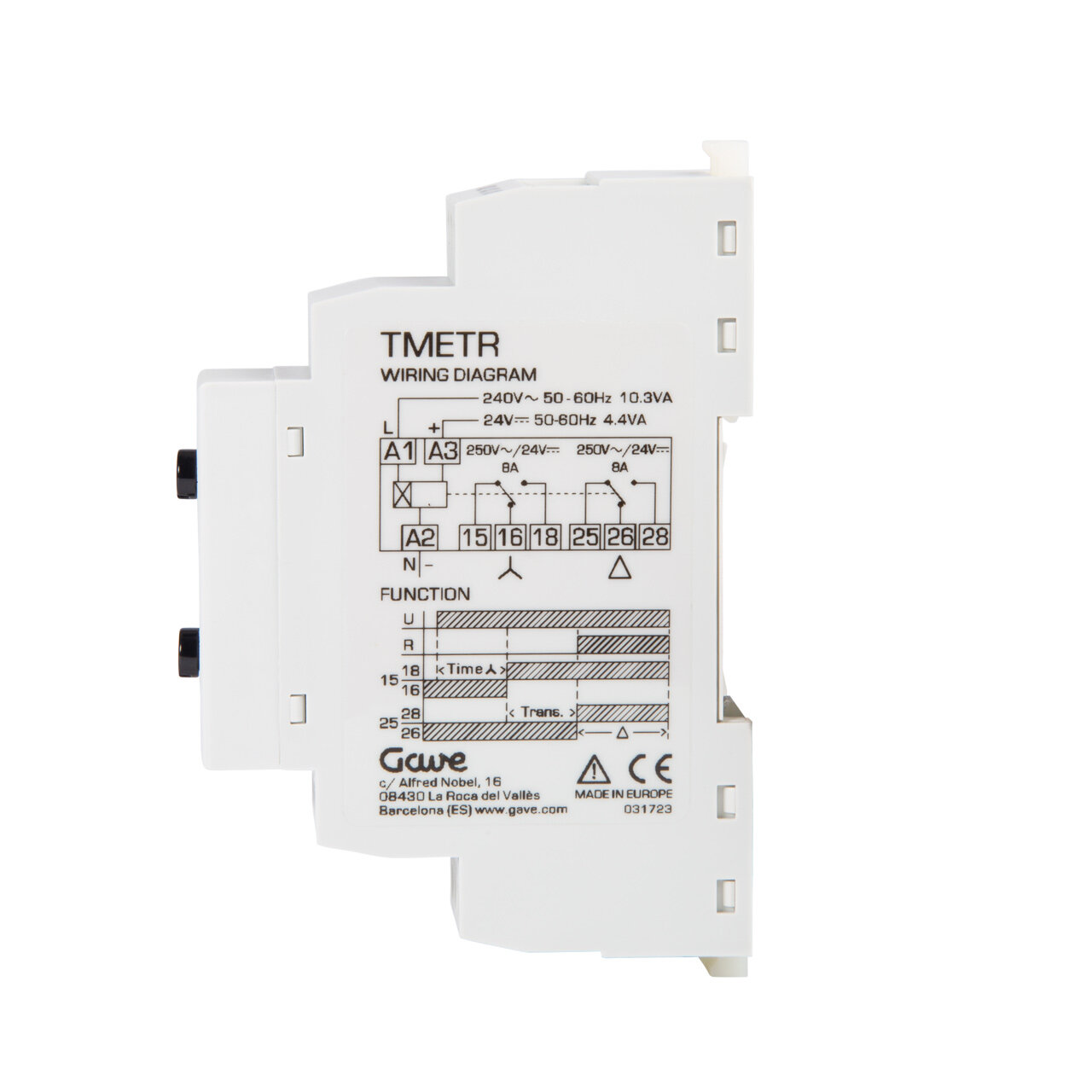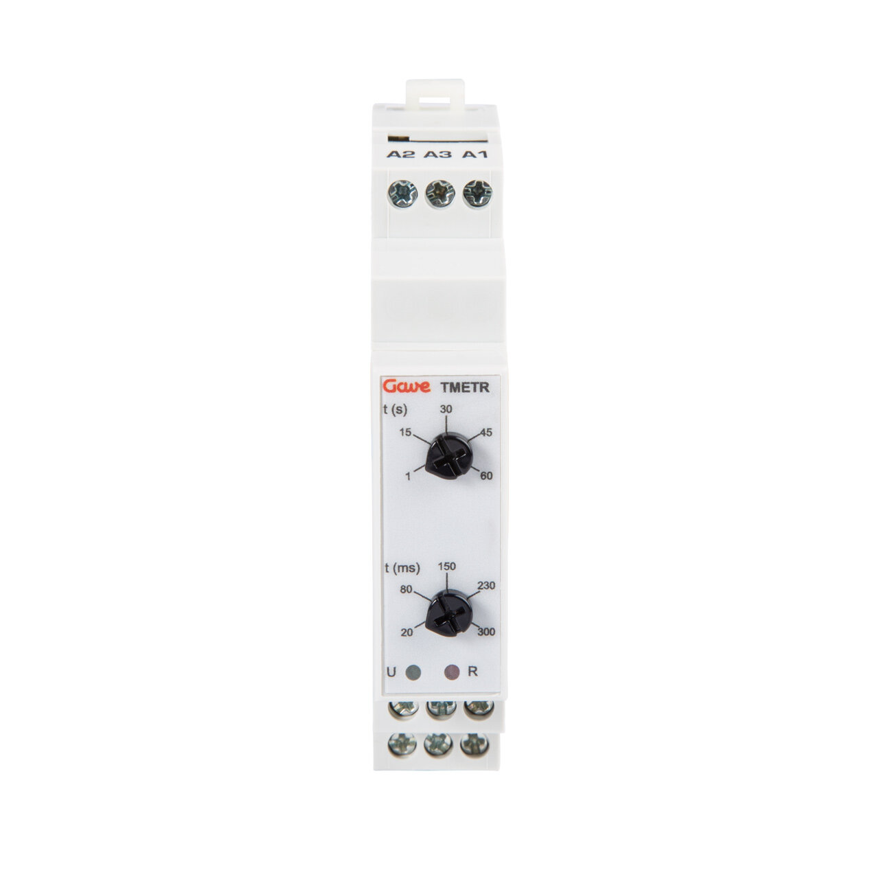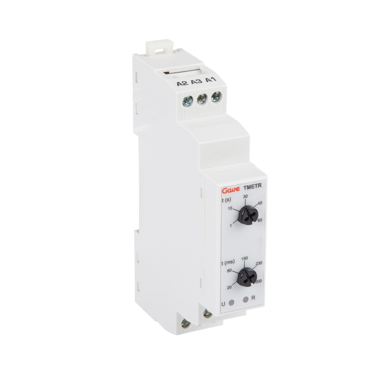 Temporizador multitensión estrella-triángulo, rango de alimentación de 24 a 230V AC 50/60Hz y 24V DC, arranque estrella-triángulo, 2 contactos conmutados de salida, intervalo entre maniobras ajustables de 20 a 300 ms, temporización estrella ajustable de 6 a 60 segundos, les indicador de estado de relé, un módulo de ancho y montaje sobre carril DIN.